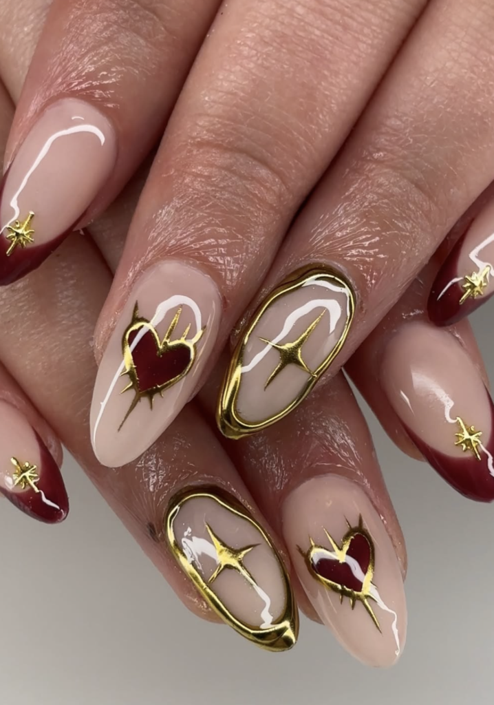 These nails are pure winter luxury — creamy neutrals, deep burgundy accents, and molten gold framing that looks almost jewel-like. @donebyhanna_ turns every heart and sparkle into a tiny piece of art, giving the set a warm glow that feels perfect for holiday parties.