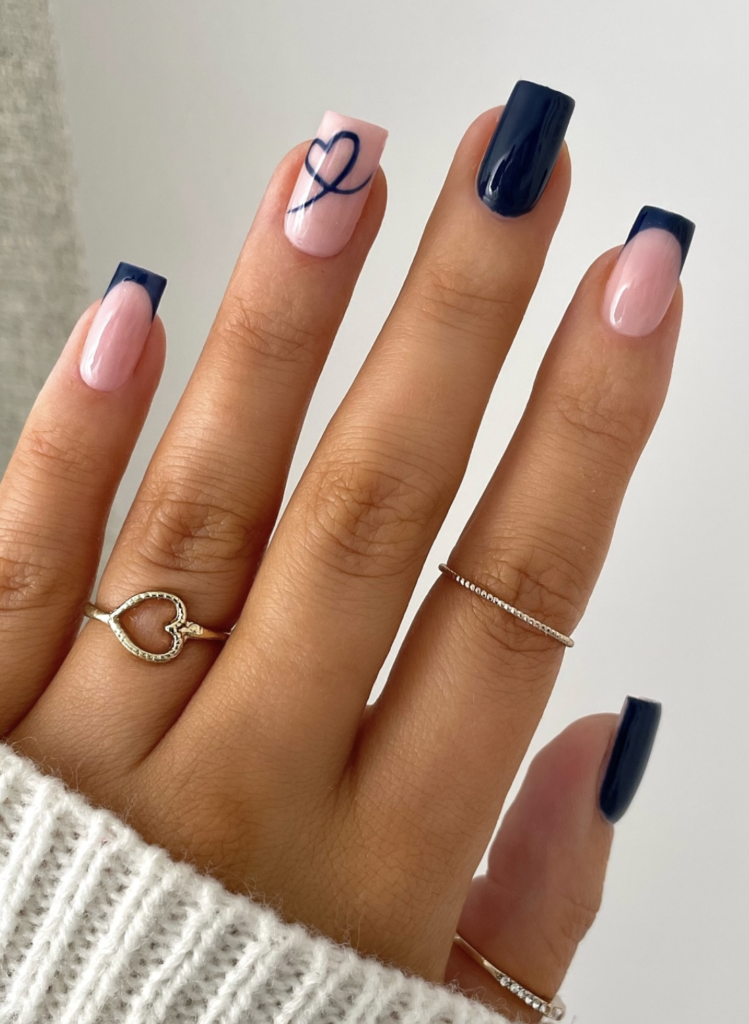 There’s something so soft and minimal about the navy-and-blush pairing here. @by_hannahtaylor keeps things simple with a delicate heart outline and bold midnight French tips — just enough detail to feel special without overwhelming the look.