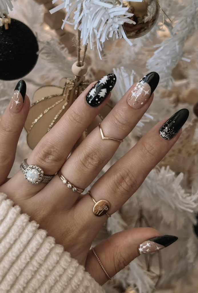 Black-and-nude winter nails have a way of feeling mysteriously chic, and this set leans into that energy beautifully. The matte black tips, the tiny white trees, the sprinkle of glitter — it feels like a winter night sky captured on your fingertips.