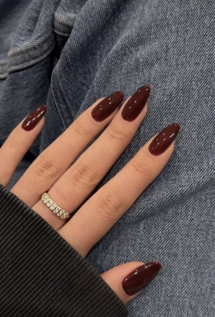 A deep, glossy wine shade always feels right in winter — warm, comforting, and a little sultry. This almond-shaped set nails the simplicity. No extra sparkle, no patterns, just one rich color that does all the talking.
