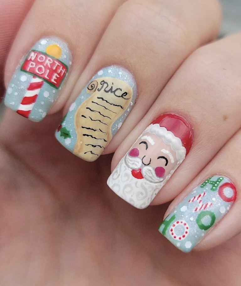 These nails are full-on holiday charm — hand-painted Santa, candy canes, the North Pole sign, even a tiny “nice” list. It looks like a cozy Christmas storybook illustrated across your fingertips, complete with soft snowy details.