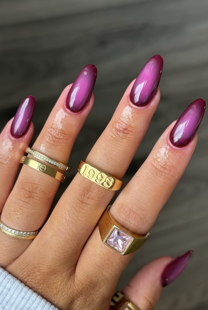 And the almond shape keeps everything soft and elegant, never harsh. It feels luxe without trying, the kind of manicure that earns compliments from strangers in the checkout line. A perfect “quiet luxury, but make it berry” vibe.