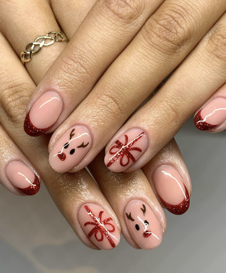 This set strikes the sweetest balance between festive and chic. The micro-glitter red French tips shimmer just enough, while the reindeer accents and ribbon-wrapped nails bring in that playful holiday spirit.