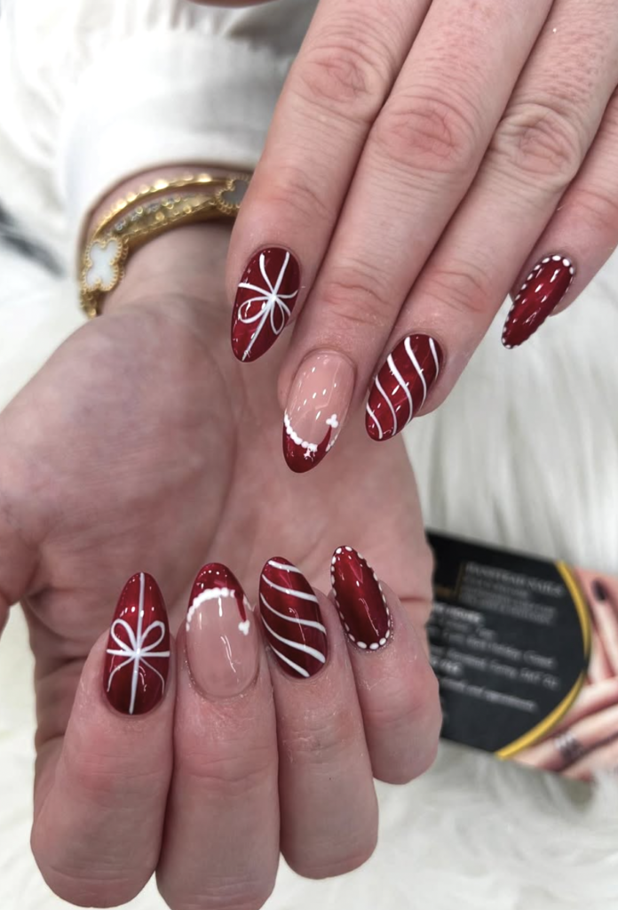 These nails are basically tiny holiday presents — rich red, bow details, stripes, and dotted trims that feel like the prettiest wrapping paper. @banstead_nails nails that festive-but-polished balance, giving you winter spirit without crossing into novelty.