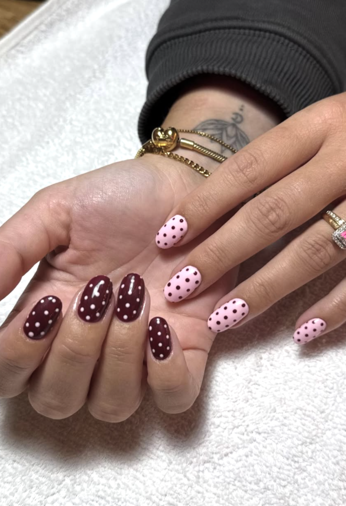 A polka-dot moment for winter? Surprisingly perfect. The contrast between rich burgundy and soft pink keeps things cozy and cute, like a mix-and-match winter pajama set but make it manicure-level polished.