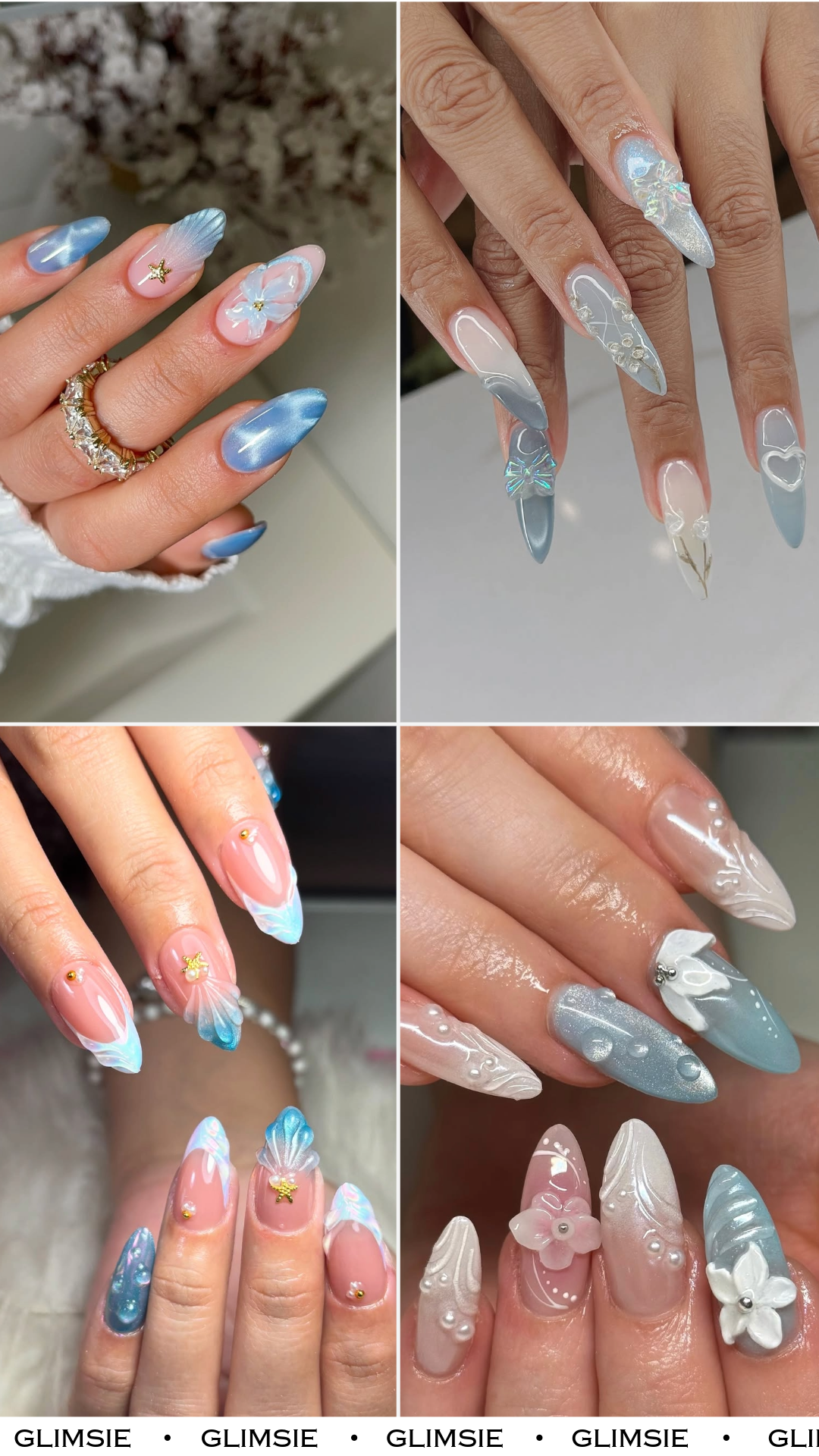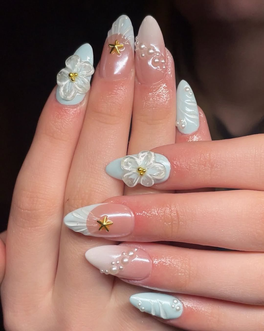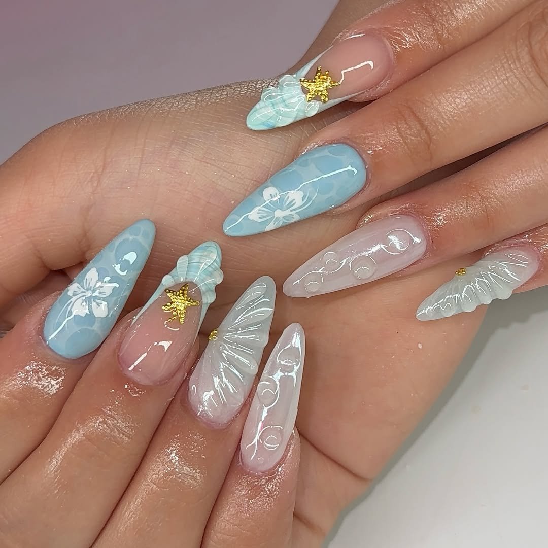 These nails feel like frozen seashell jewelry. The translucent blue tips and sculpted shell accents add depth, while tiny gold studs and star charms bring a touch of sparkle.