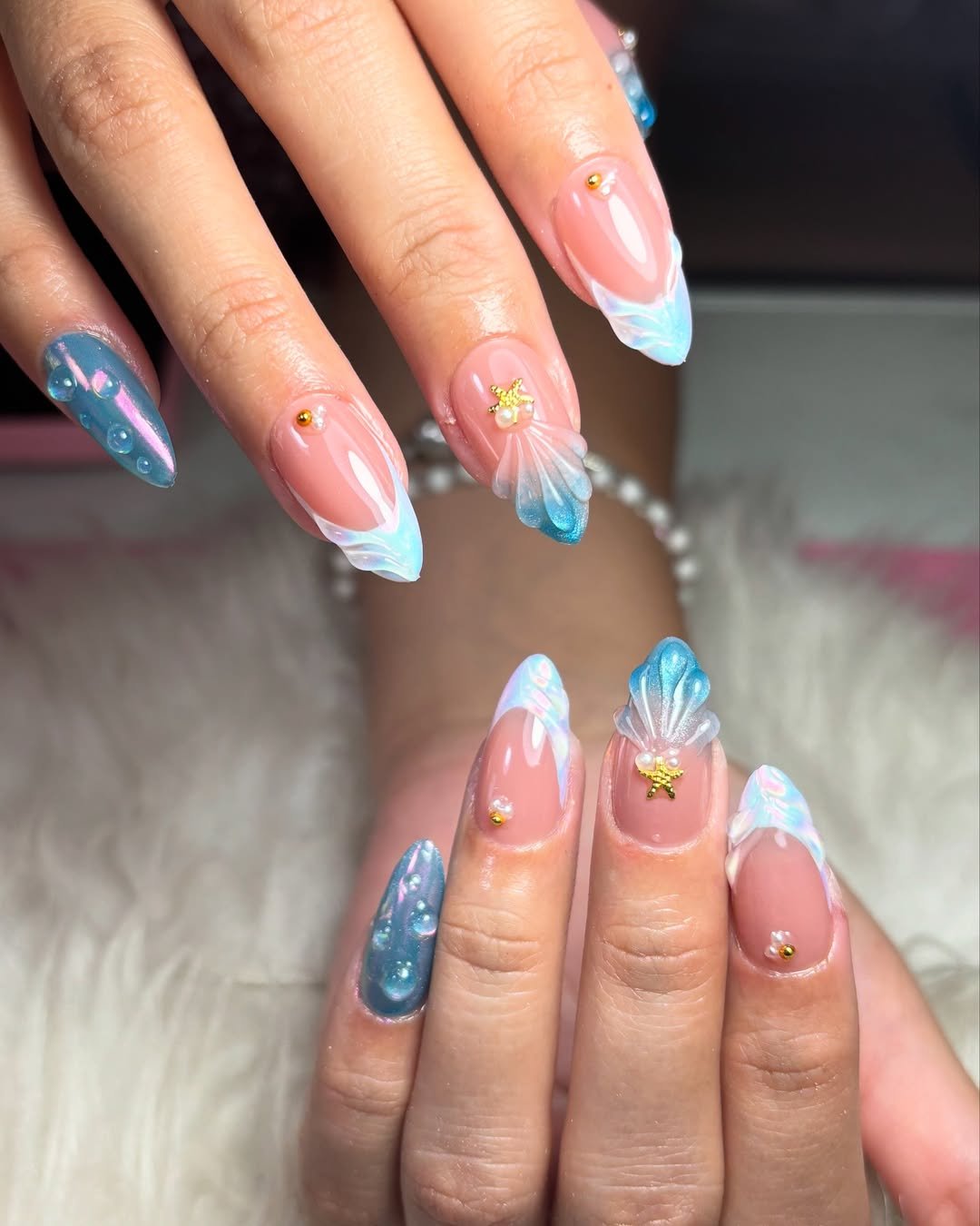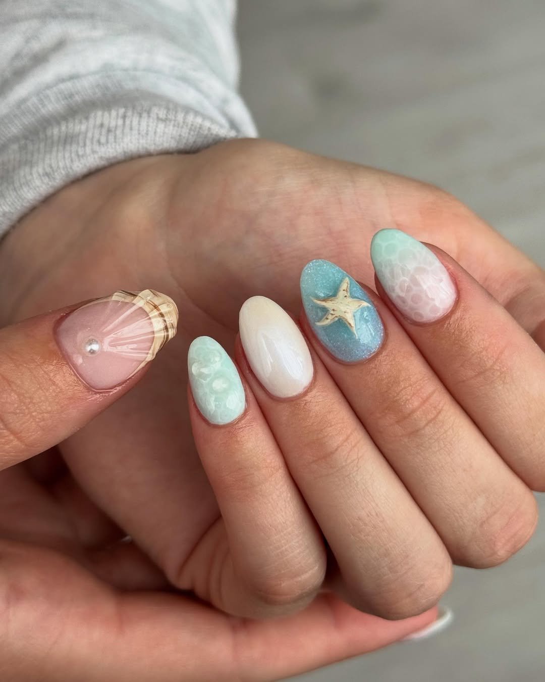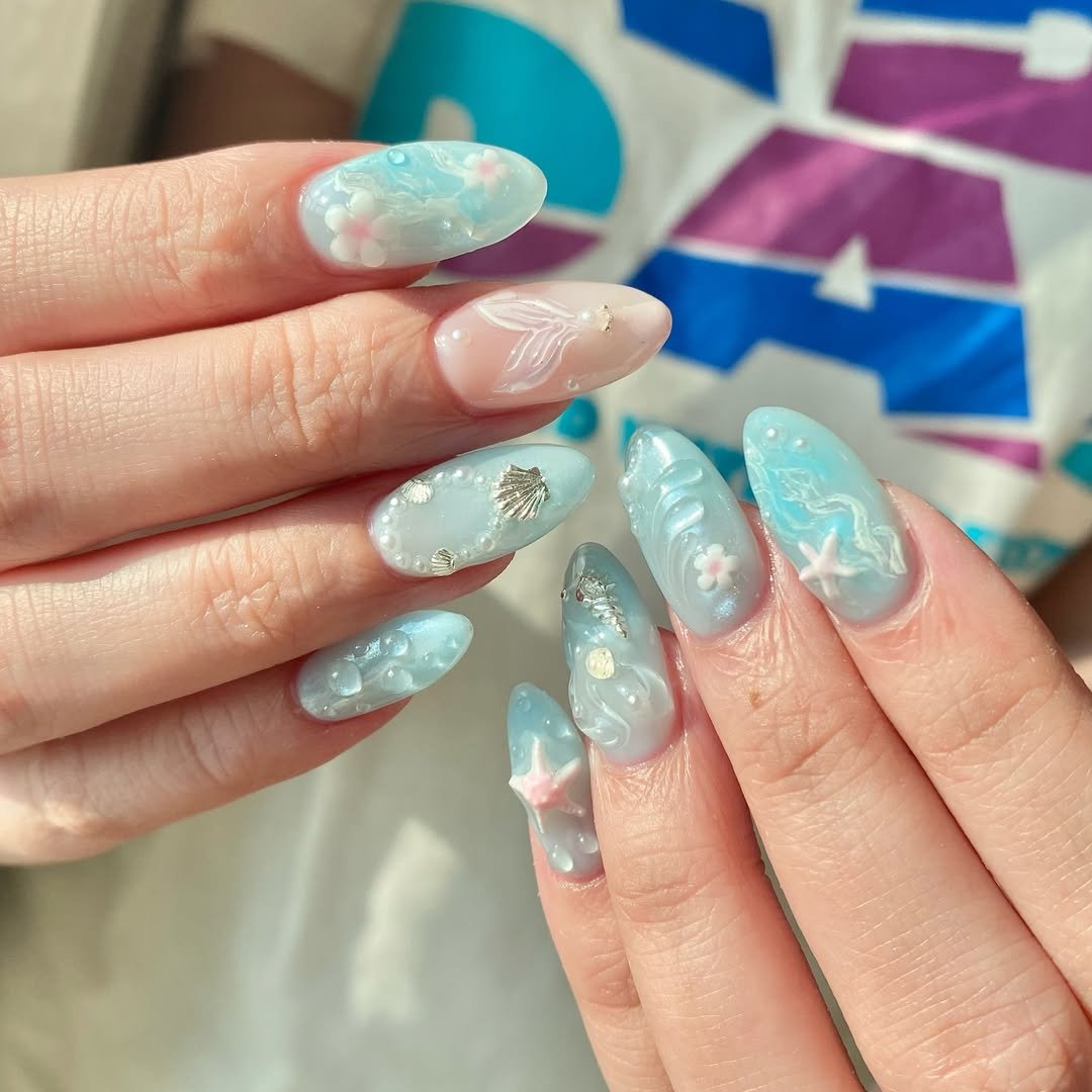 These nails look like they belong under the sea during winter. Soft aqua shades, pearl details, and shell accents create a dreamy underwater-inspired manicure.