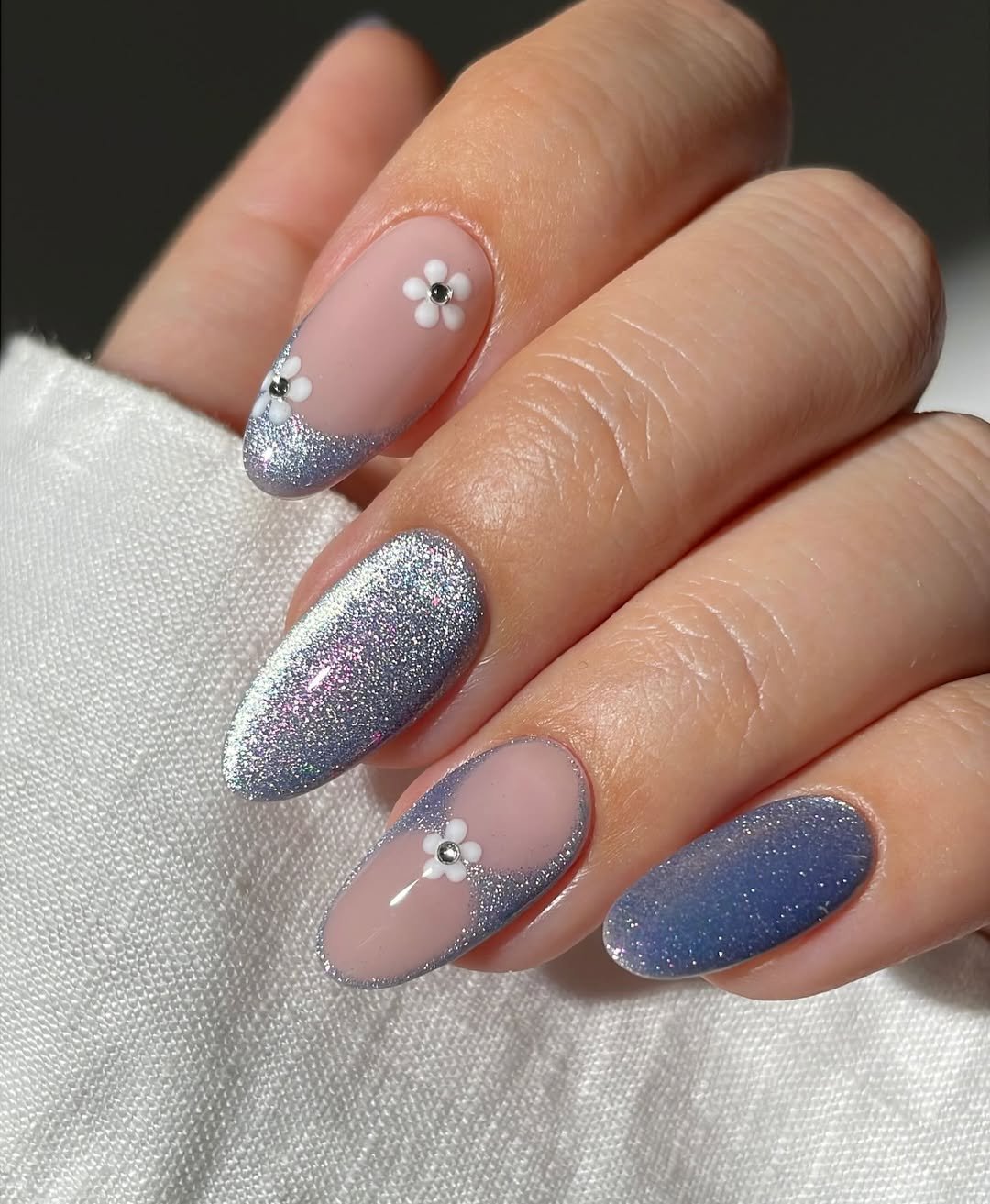 Tiny daisy details add a cute, almost retro touch that makes the whole set feel lighthearted. It’s simple, sparkly, and the kind of manicure that quietly stands out without trying too hard.