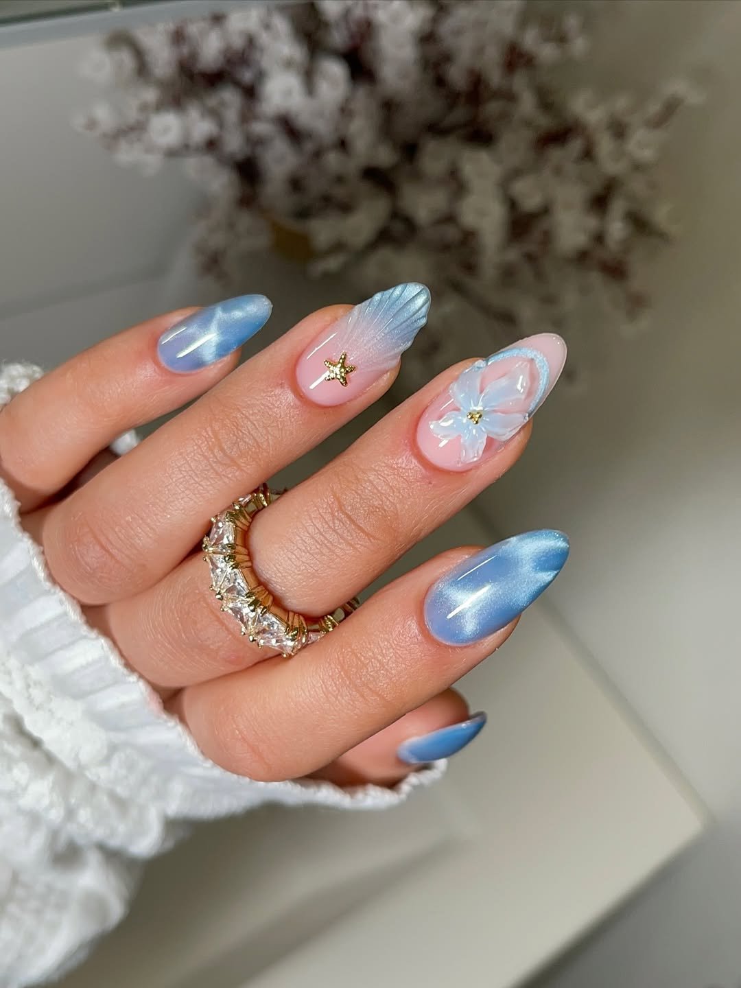 These nails look like they were dipped straight into icy seawater. The soft blue chrome shimmer gives that frozen-glass effect, while the delicate shell texture and tiny gold star charm add just enough detail to keep things interesting.