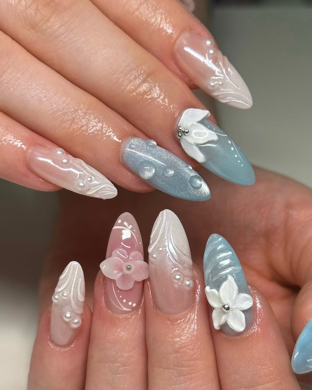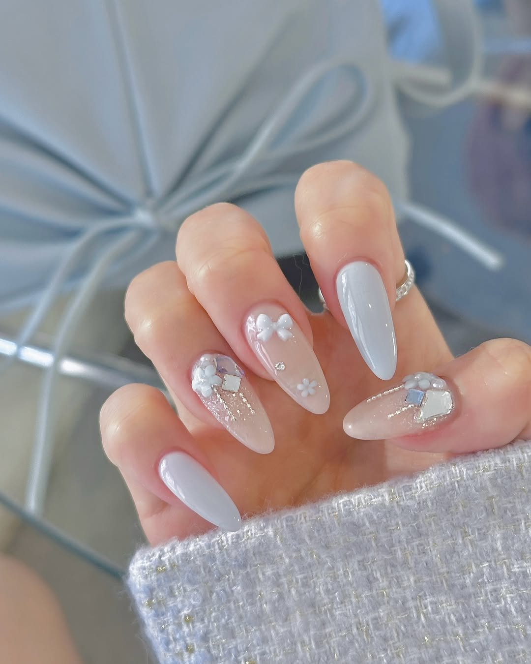 Even with all the textures, the soft pastel palette keeps it cohesive. It’s the kind of manicure that feels like a miniature winter sculpture—beautiful, intricate, and impossible not to stare at.