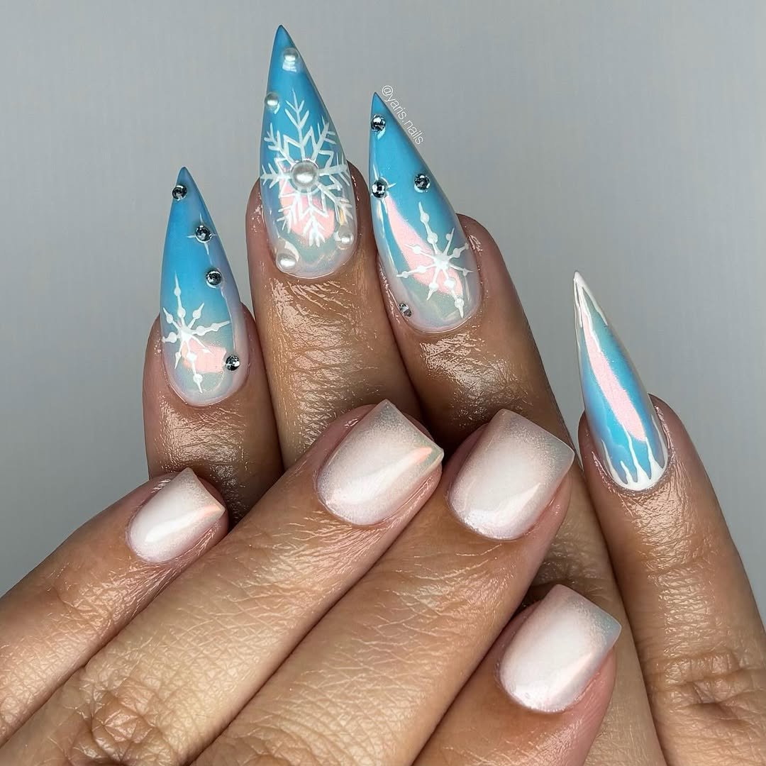 The long pointed shape makes everything feel dramatic and bold, while the tiny gems scattered across the design add extra sparkle. It’s glamorous, icy, and definitely made for someone who loves statement winter nails.