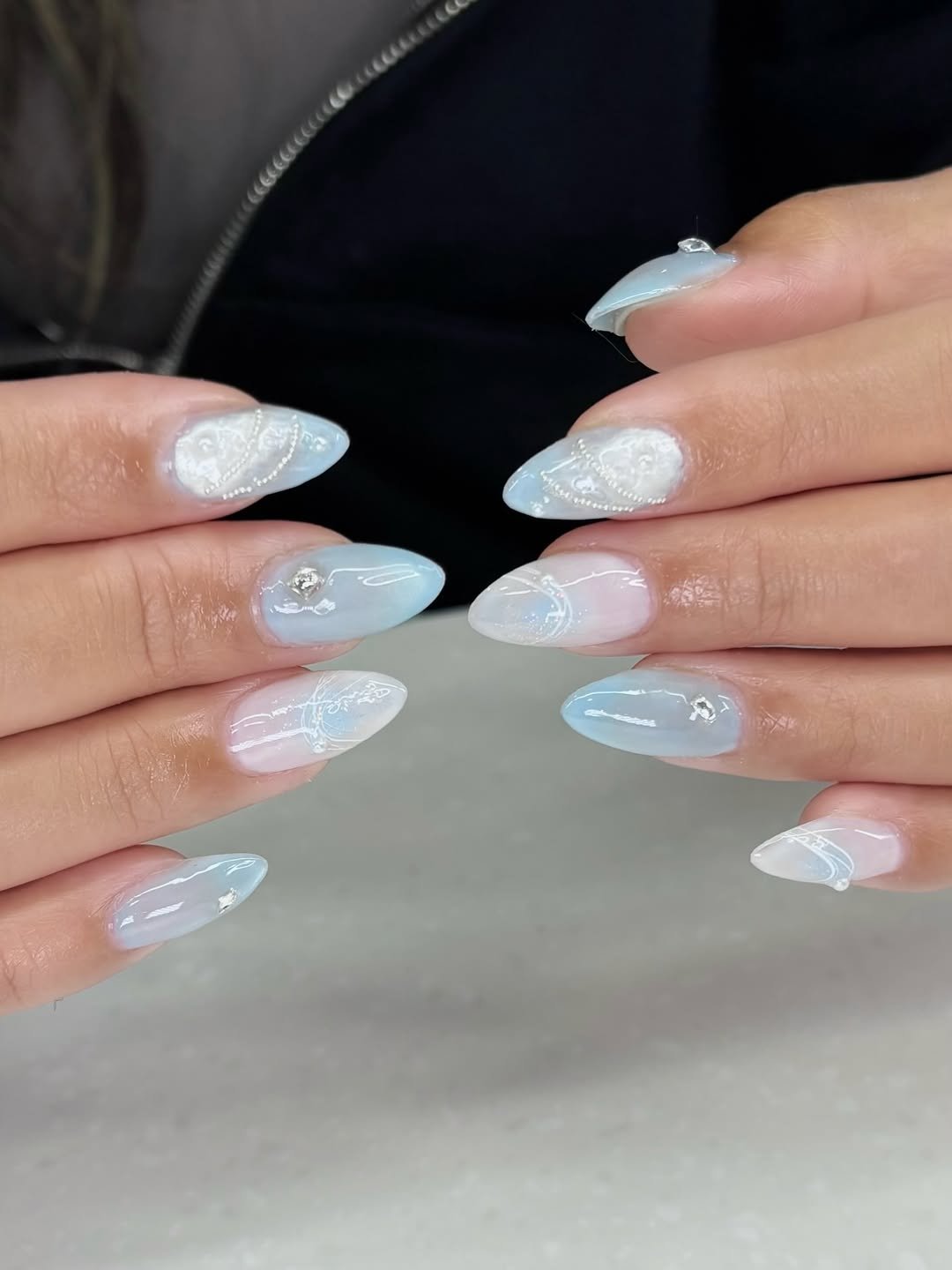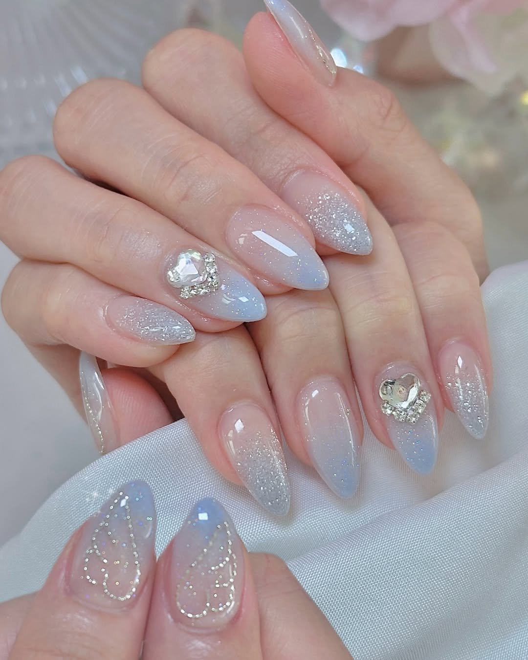 Tiny crystals and subtle gradients keep everything looking light and airy. It’s one of those manicures that feels classy, romantic, and quietly luxurious.
