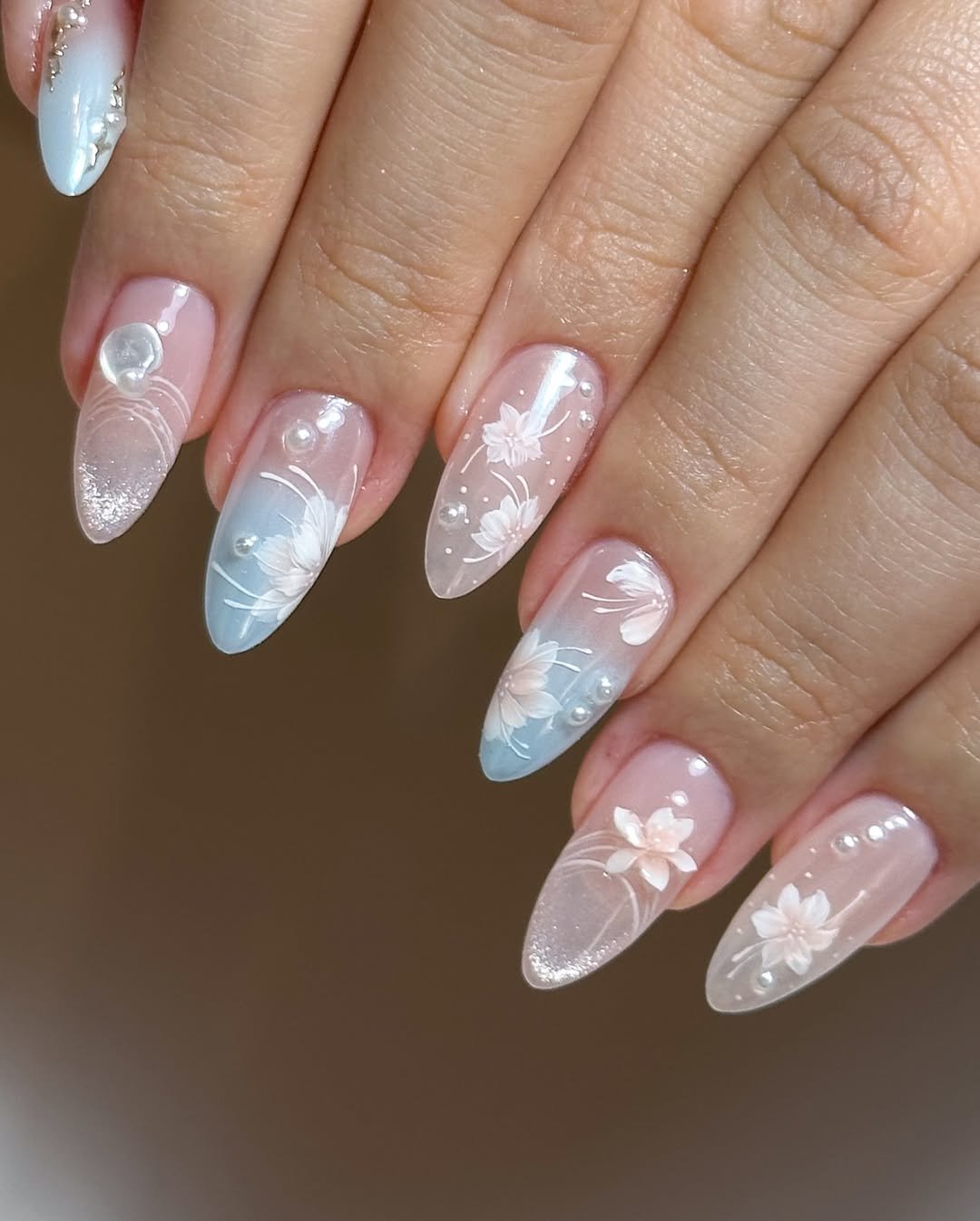 Tiny blue flower accents and scattered glitter keep the set from feeling too heavy. It’s delicate, sparkly, and the kind of manicure that quietly screams “special occasion.”