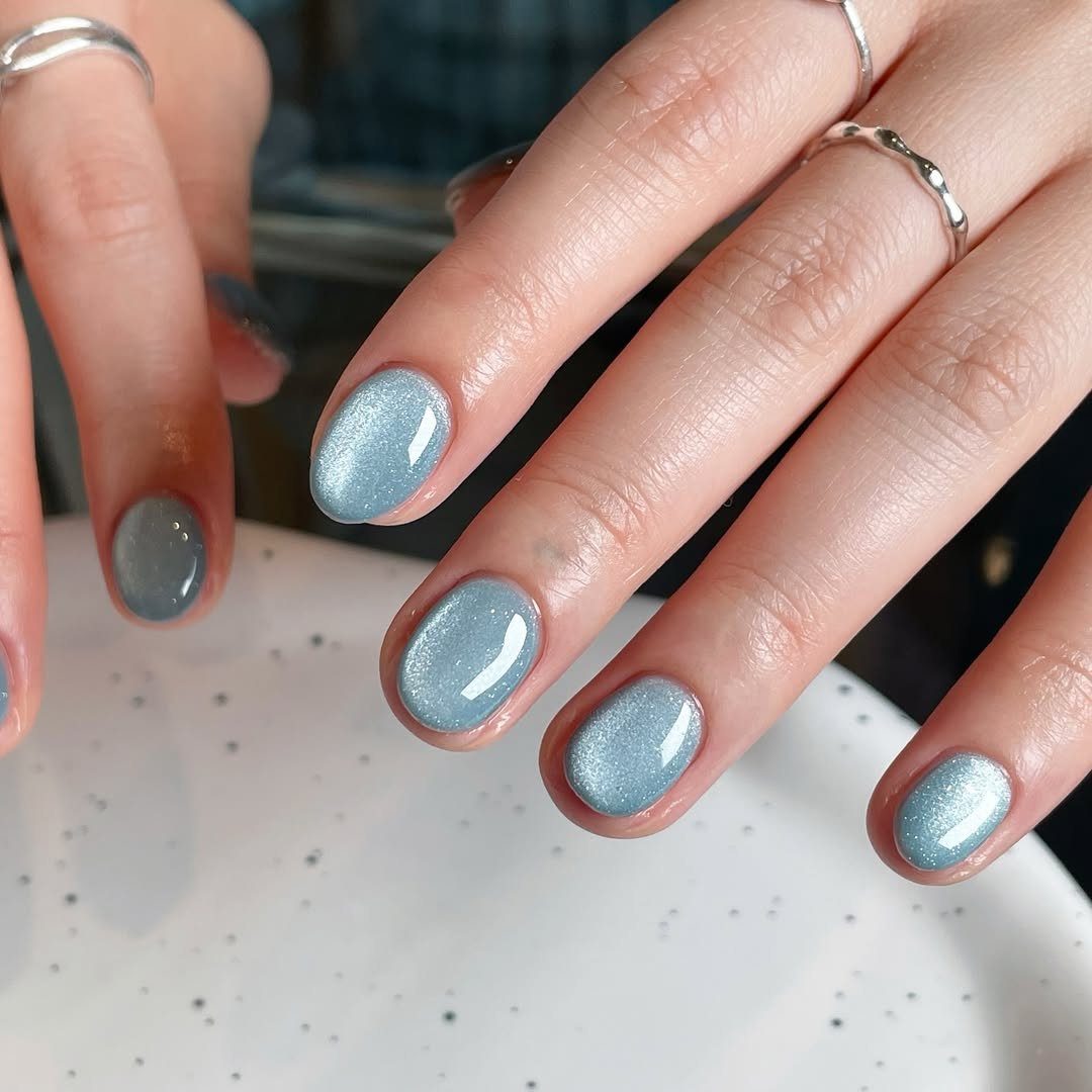 Sometimes less really is more. These short icy-blue nails keep things clean and minimal with a soft shimmer that catches the light beautifully.