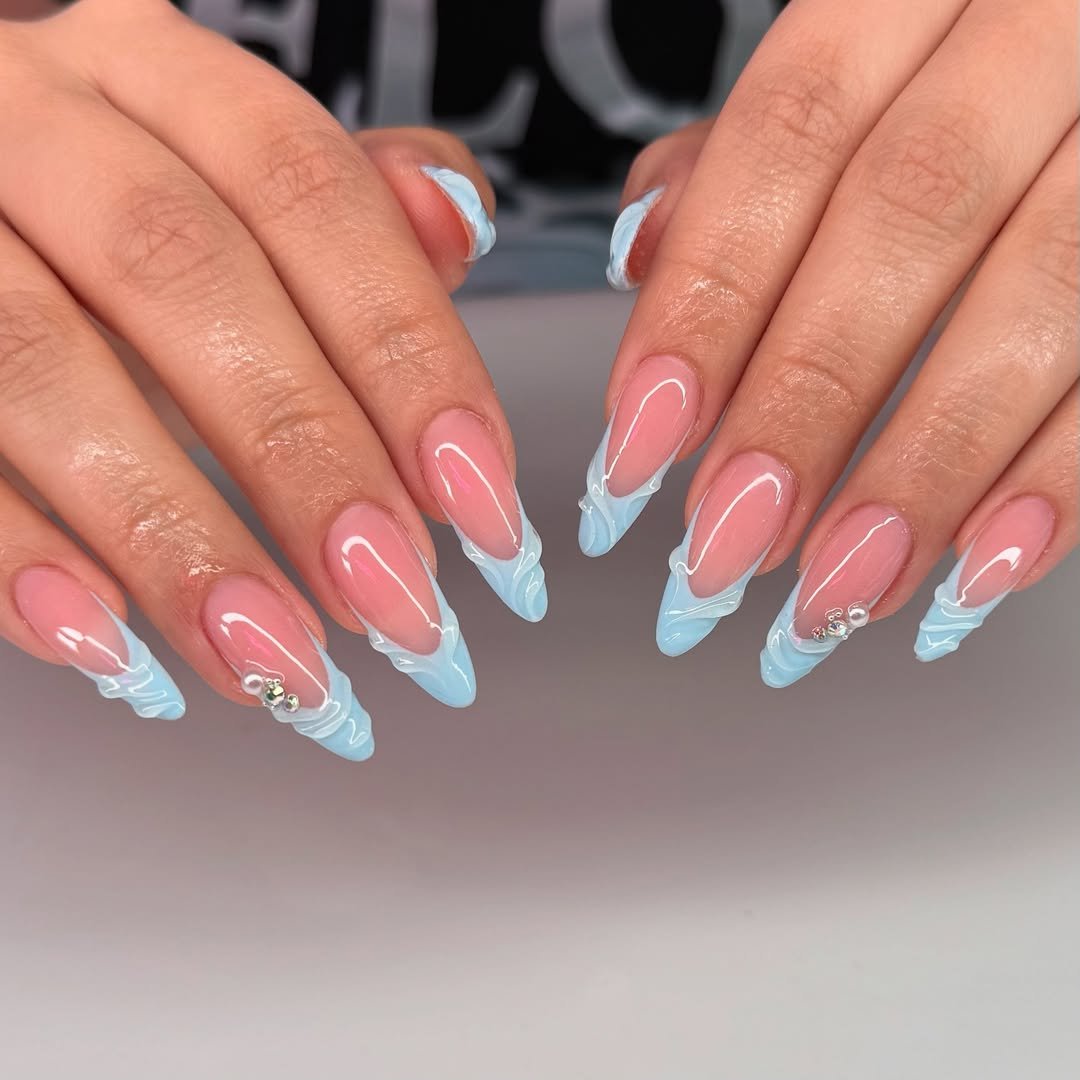 These nails give a modern twist to the classic French tip. The soft pink base keeps things clean while the icy-blue sculpted tips add a flowing, almost wave-like texture.