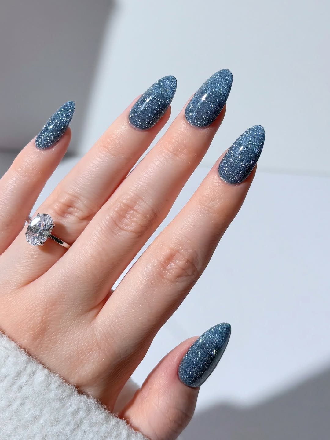 These nails feel like a quiet winter night captured in polish. The deep icy blue base is packed with tiny shimmer particles that sparkle just enough to mimic fresh snow under moonlight.