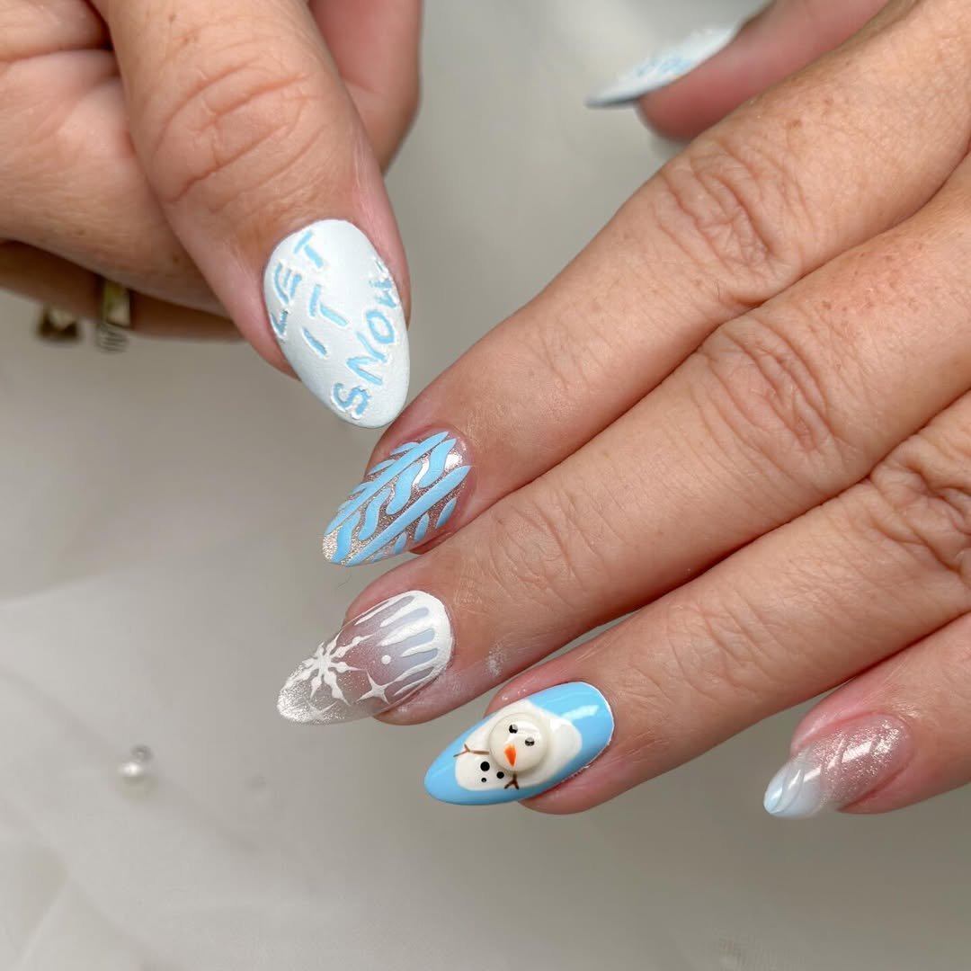 This set is basically winter fun bottled up in nail form. Between the cute little snowman, icy blue patterns, and soft white details, every nail feels like a tiny piece of a snowy day story.