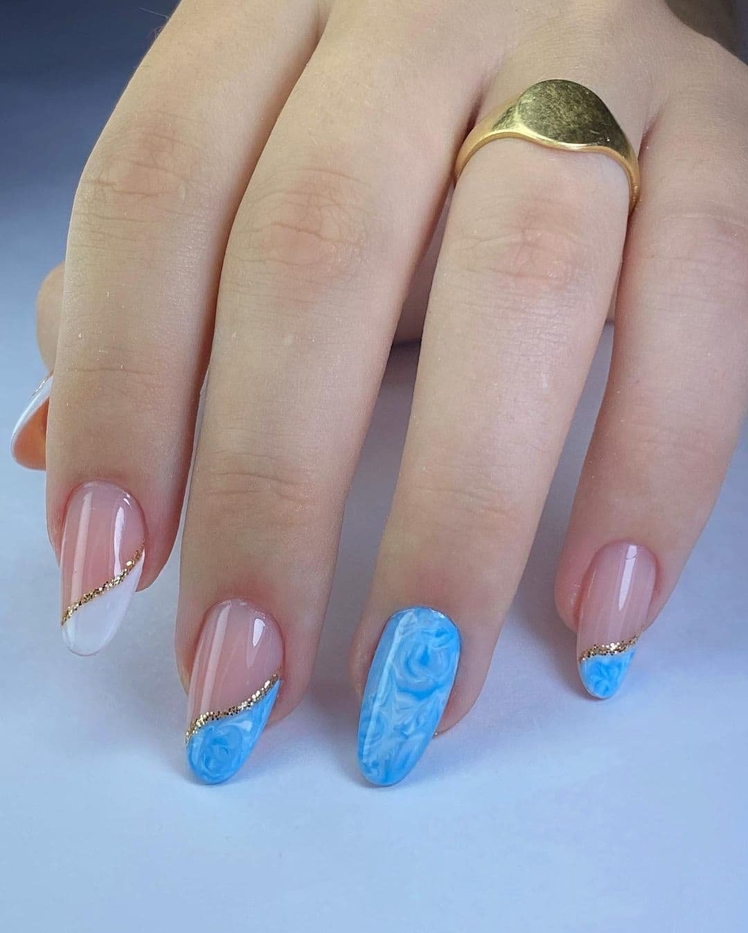 This set puts a fresh spin on the classic French tip. Instead of the usual white, the tips feature a dreamy sky-blue marble effect that feels soft and artistic.