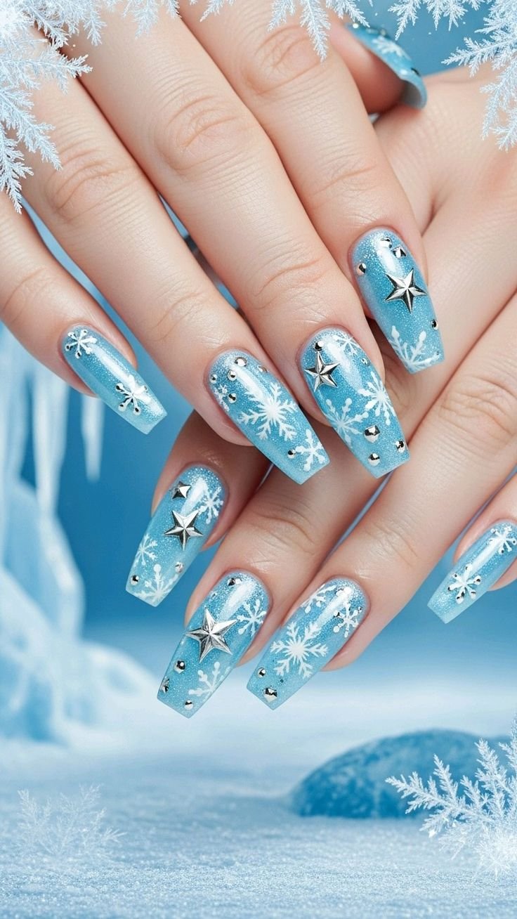 This design goes full winter wonderland. The icy blue glitter base paired with crisp white snowflakes instantly creates that magical holiday vibe.