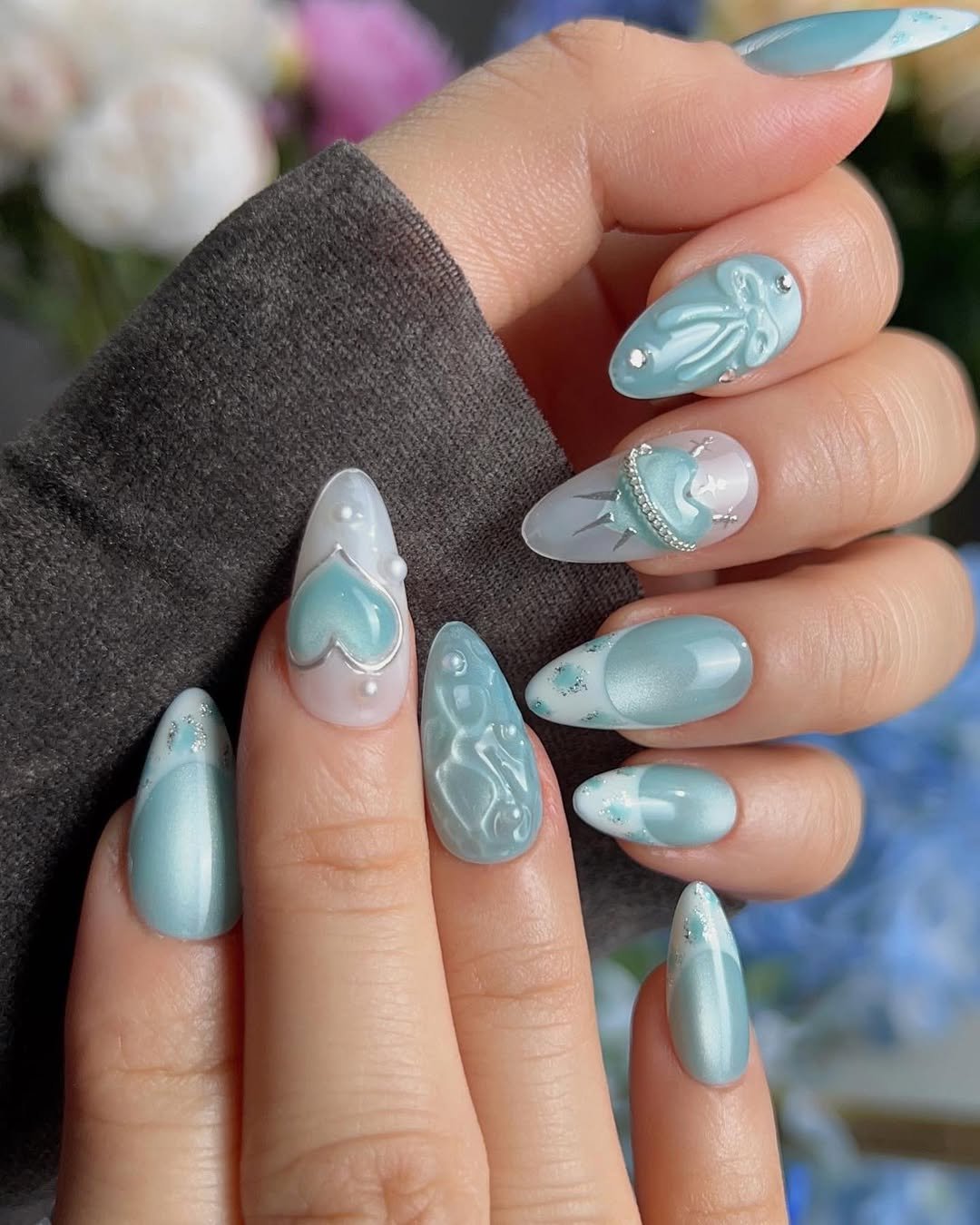 This set mixes delicate florals with soft winter tones in the prettiest way. The pale blue accents, raised flowers, and tiny pearls make each nail feel like a miniature piece of jewelry.