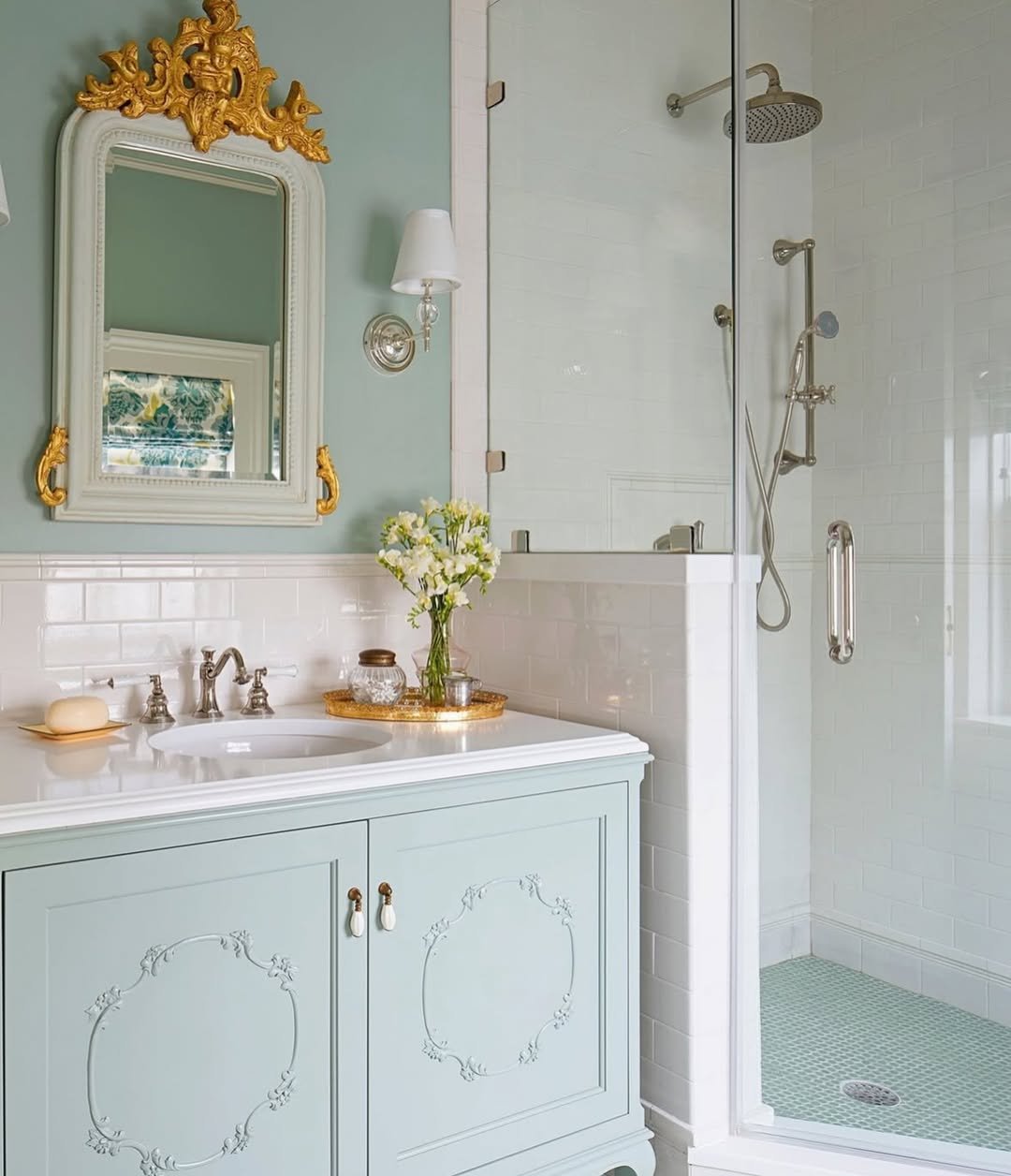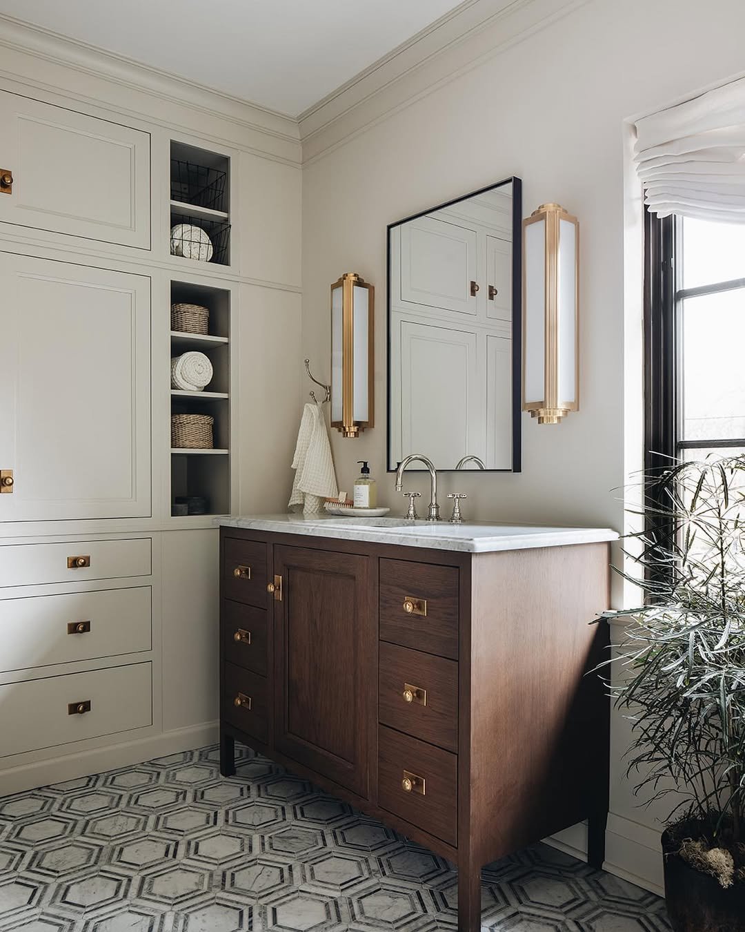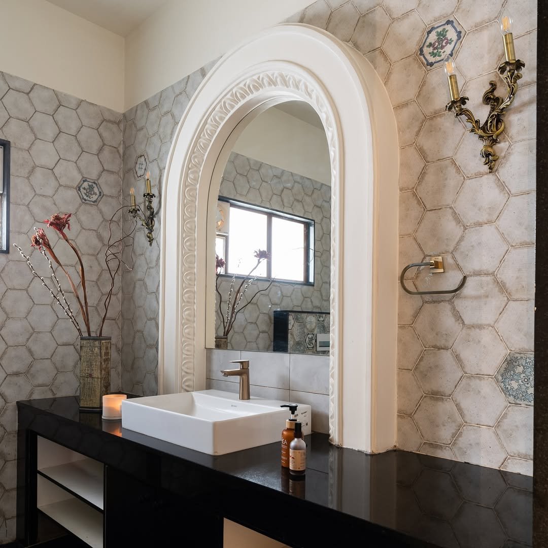 This one leans into character—and it does it so well. The textured hex tiles, ornate mirror frame, and those vintage sconces all work together to create a space that feels collected over time.