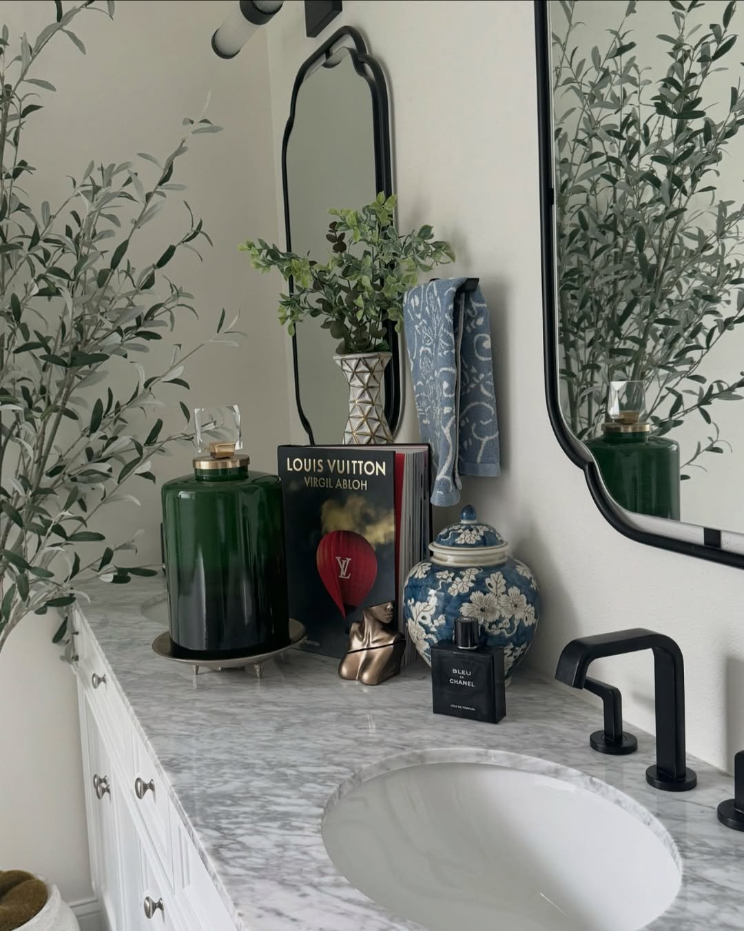 That contrast is what makes it work. A small plant, a soap dispenser, and you’re done. It’s proof that when your backdrop is strong, your styling can be super simple and still hit.