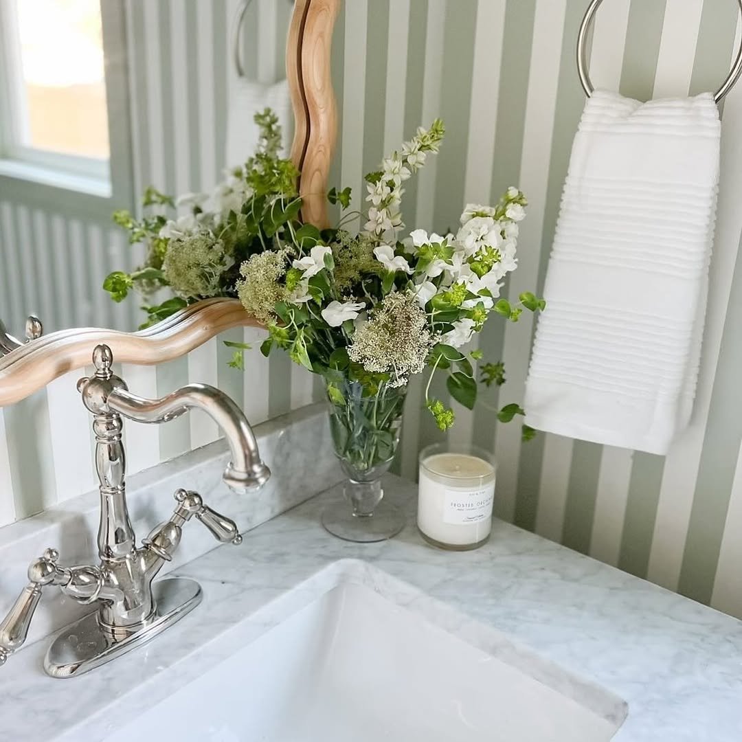 This little corner feels like a breath of fresh air—literally. The striped wallpaper sets a soft, tailored backdrop, but it’s that loose, garden-style bouquet that steals the show. It’s not overly arranged or fussy, just casually beautiful like you picked it up on your morning walk.