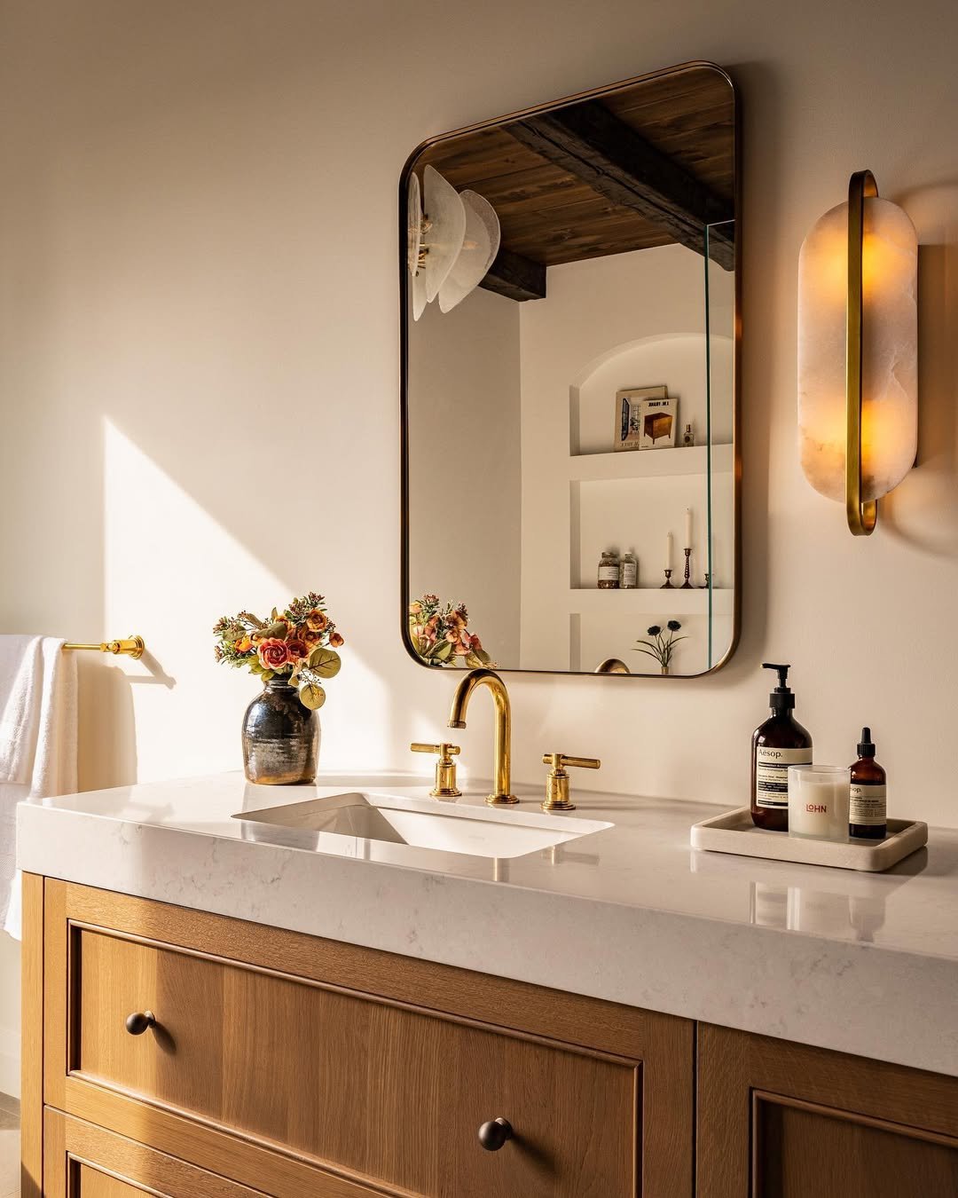 And the styling? Barely there, but exactly right. A single dried arrangement and neatly folded towels underneath carry the whole look. It’s minimal, but not empty—more like thoughtfully edited.