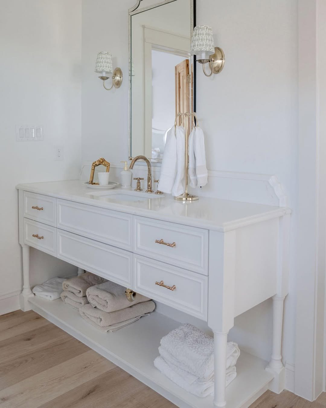 Soft, airy, and effortlessly cozy—that’s the vibe here. The all-white palette paired with warm gold accents keeps things feeling fresh but not cold.