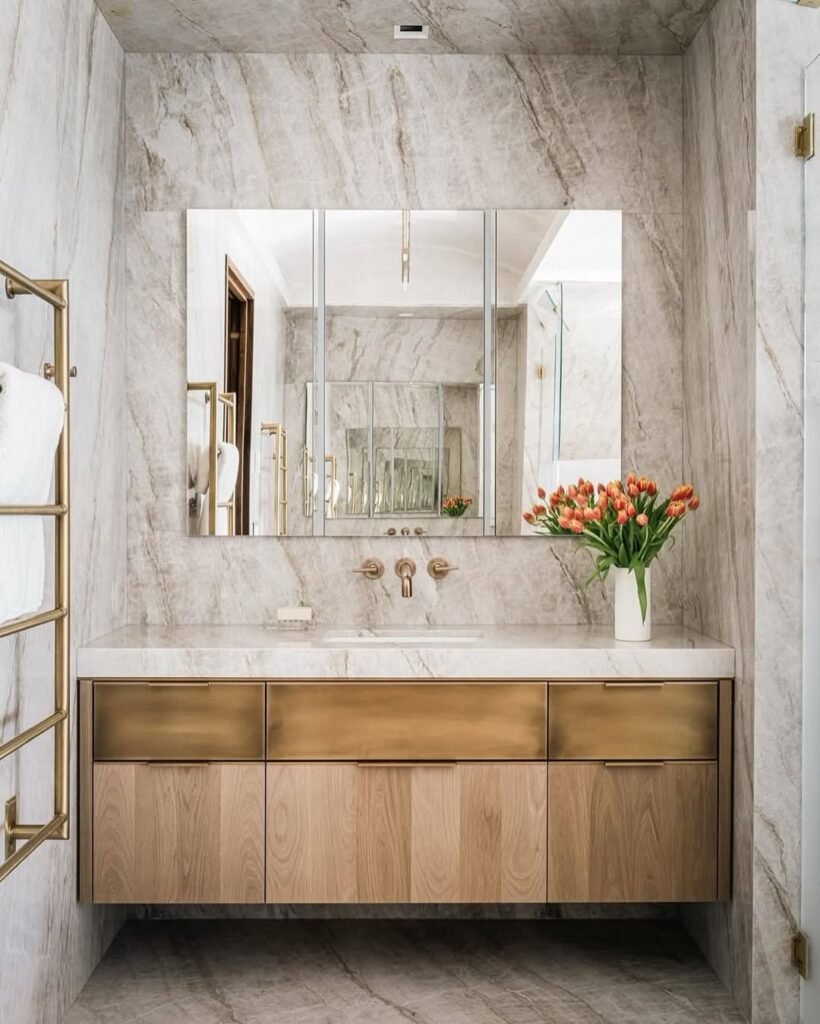 This one is all about that marble—floor to wall, it’s a full statement. The warm wood vanity and brass accents keep it from feeling too cold, adding just the right amount of contrast.