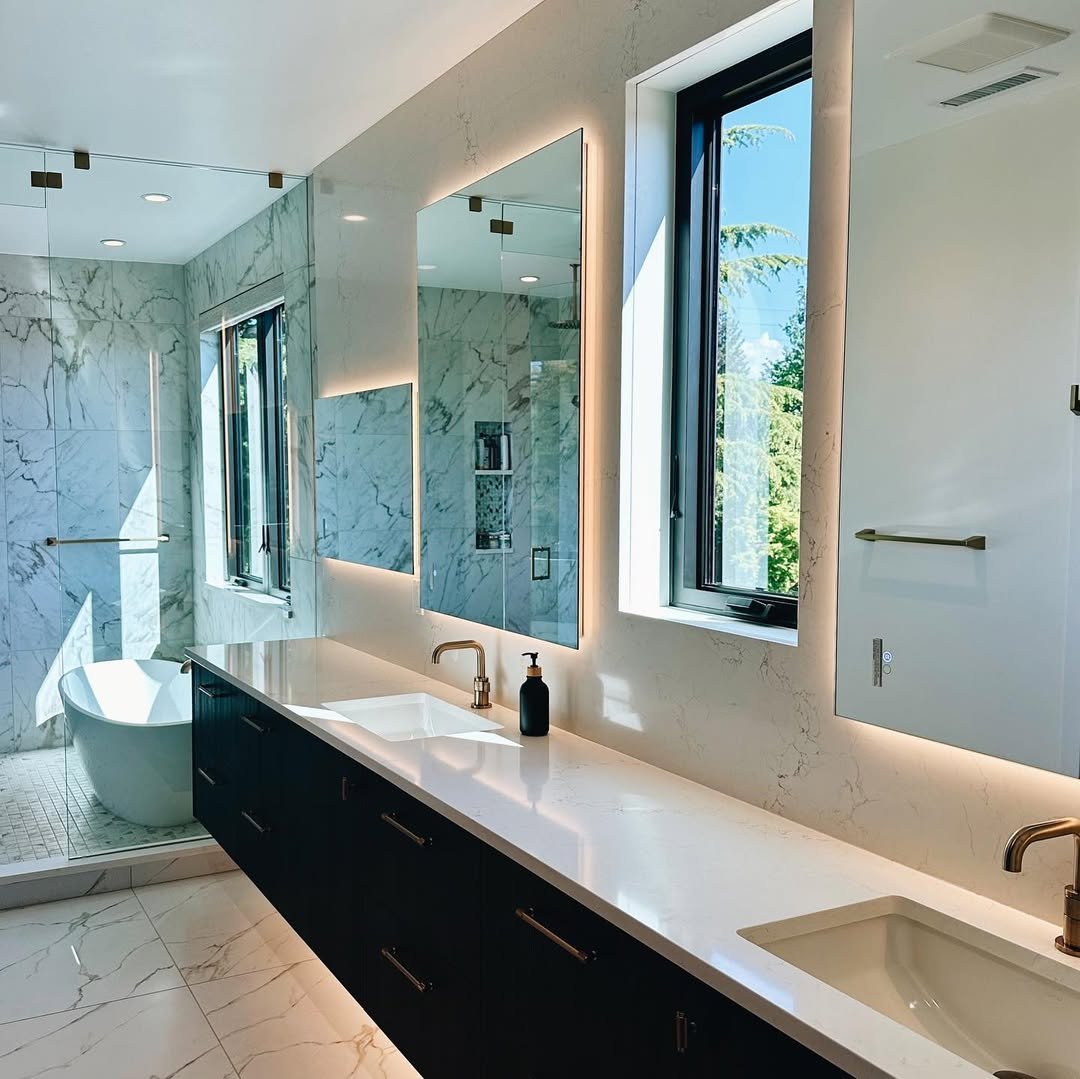 This one stretches out like a luxury hotel moment. The long vanity, glowing mirrors, and marble backdrop make everything feel expansive and calm at the same time.
