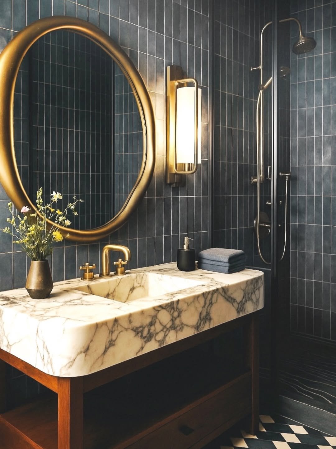 This one leans deep into mood—and it’s gorgeous. The dark tile, warm brass fixtures, and soft lighting create that almost cinematic glow that instantly elevates the space.