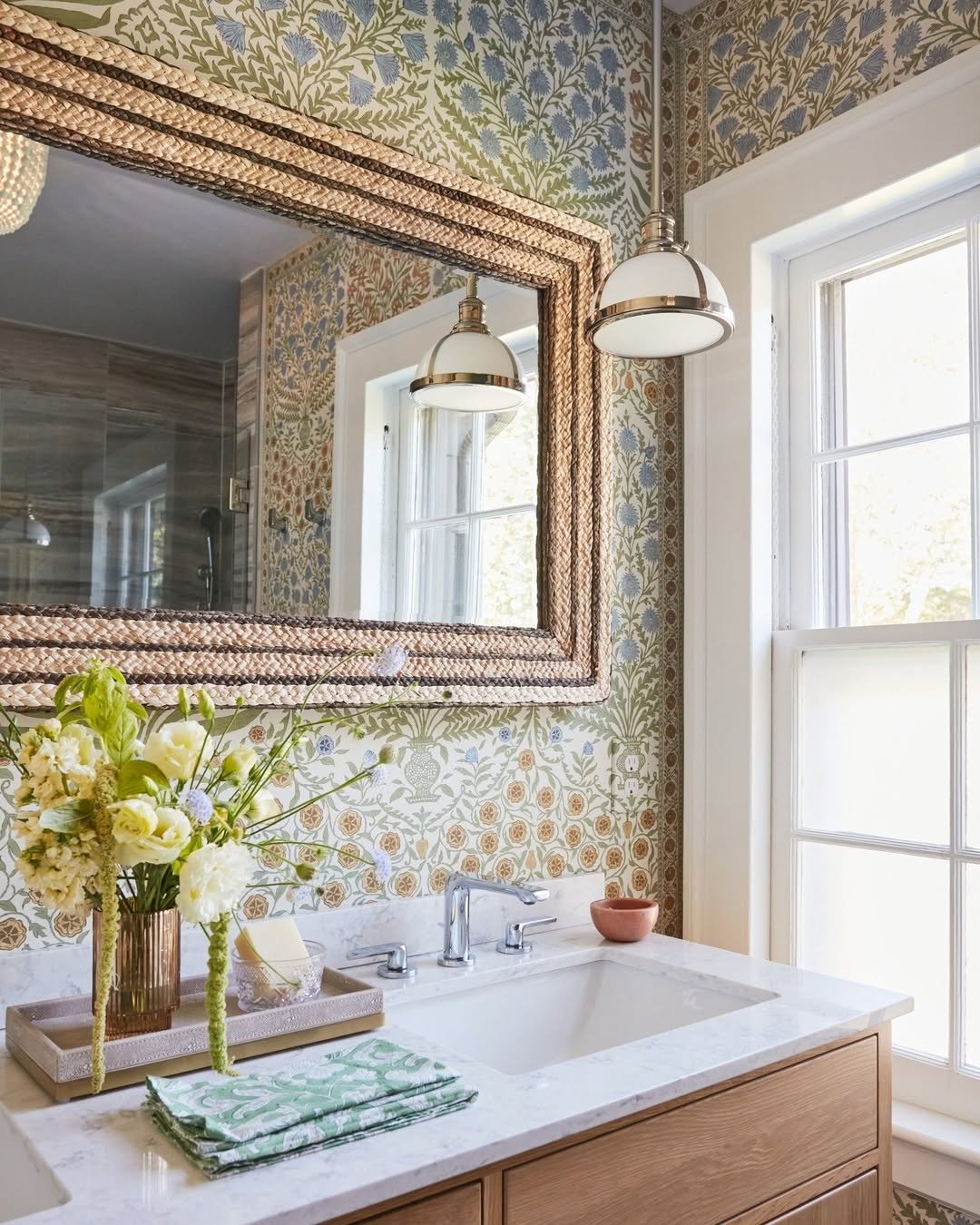 Now this is where things get fun. That intricate wallpaper instantly brings personality, while the woven mirror frame softens everything with a bit of texture.