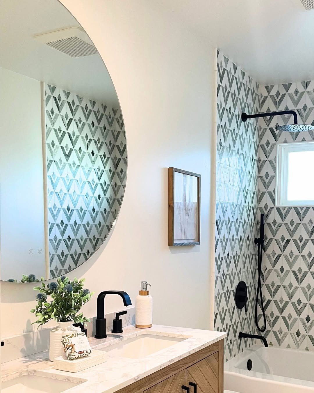 If you’re going to go bold, go all in—and this one does exactly that. The geometric tile in the shower area pulls your eye instantly, while the counter stays clean and controlled.