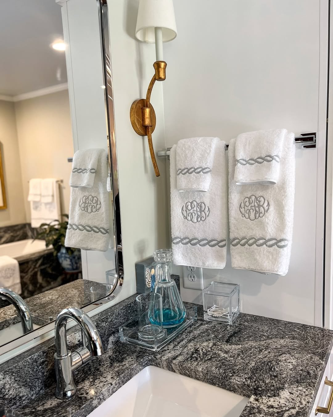 There’s a crisp, classic feel here that’s hard to beat. The granite counter, monogrammed towels, and clean-lined accessories make everything feel tailored and intentional.