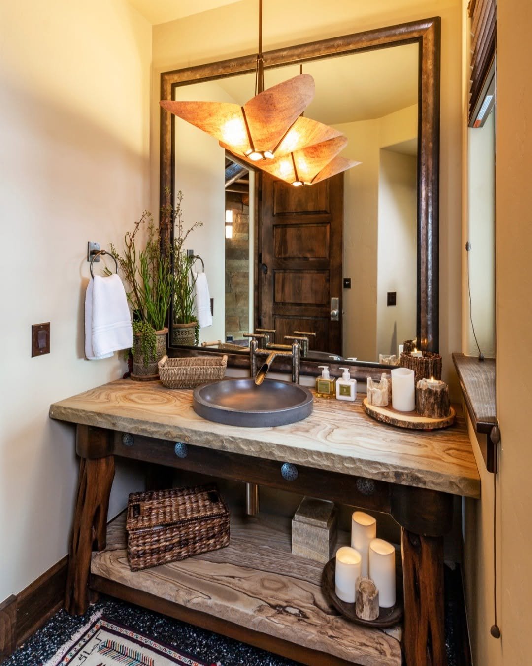This one has serious cozy cabin energy. The chunky wood vanity, vessel sink, and warm lighting create a space that feels grounded and a little bit rugged—in the best way.
