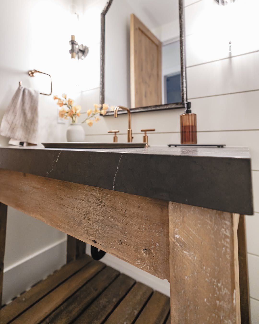 Then you layer in simple decor—a vase, a soap dispenser—and it softens the whole look. It’s rustic, but not rough. More like polished farmhouse with a modern twist.