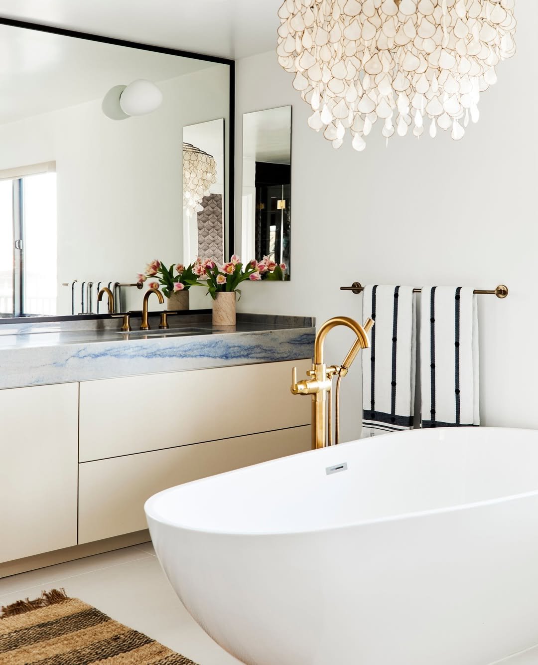 Now this is how you elevate a bathroom counter into a full design moment. The stone countertop with that soft blue veining already feels luxe, but then you layer in the florals and that statement lighting—and it becomes art.