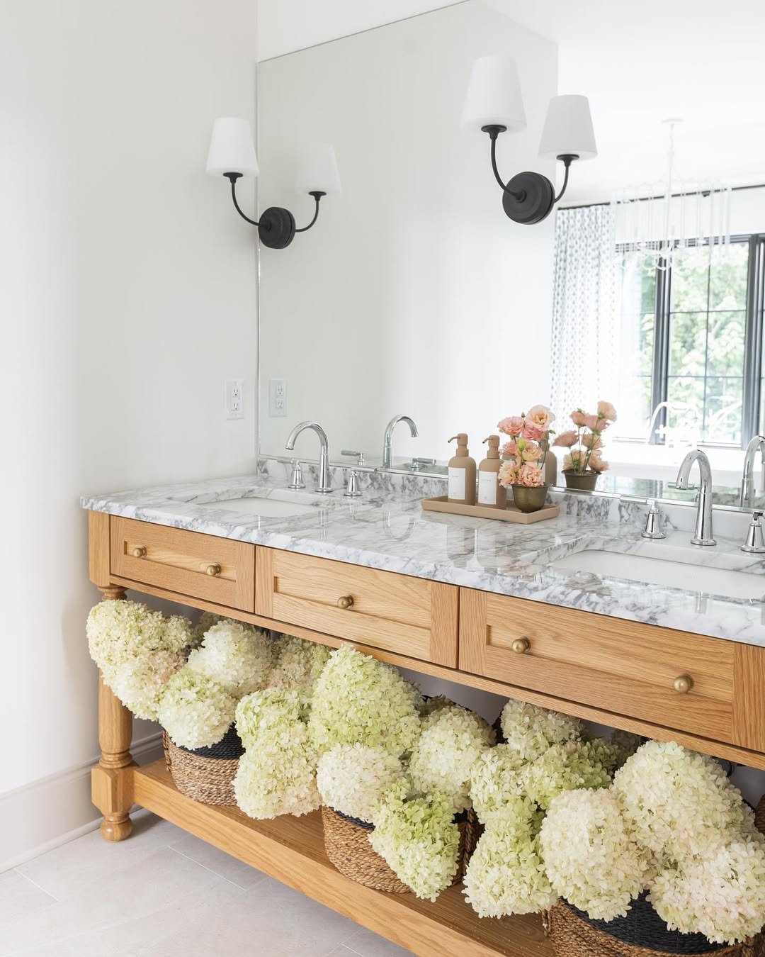 There’s something really calming about this setup. The soft wood tones, marble top, and those baskets filled with hydrangeas underneath—it all feels light, airy, and lived-in.