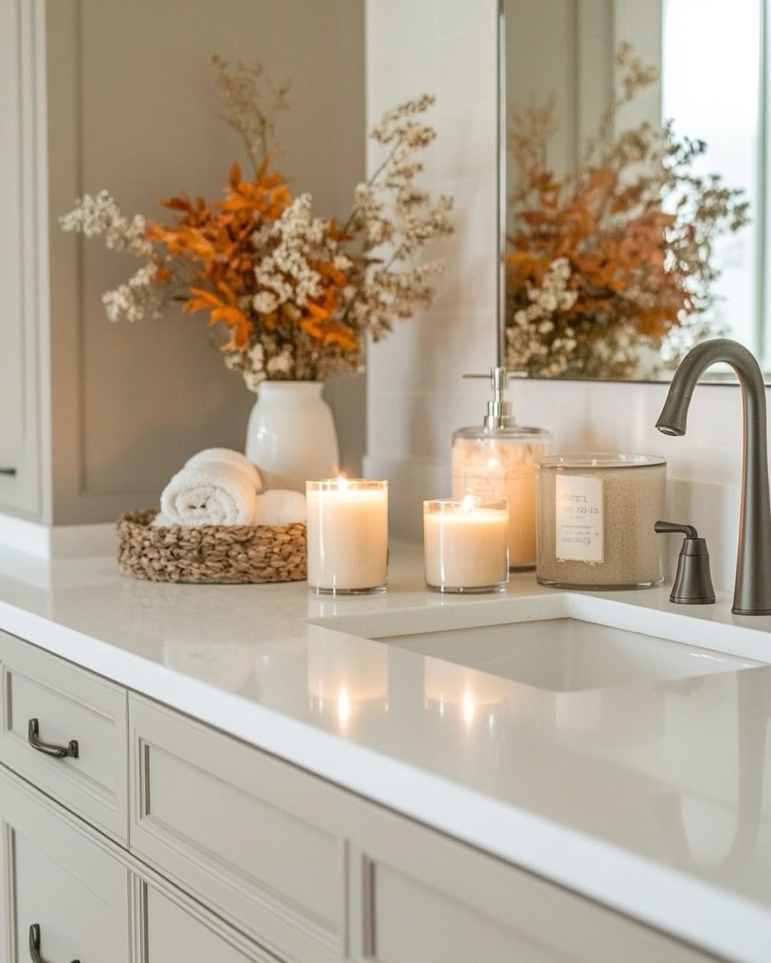This is one of those setups that instantly makes you exhale. The candles, soft tones, and that little basket of rolled towels—it’s giving full-on spa energy.