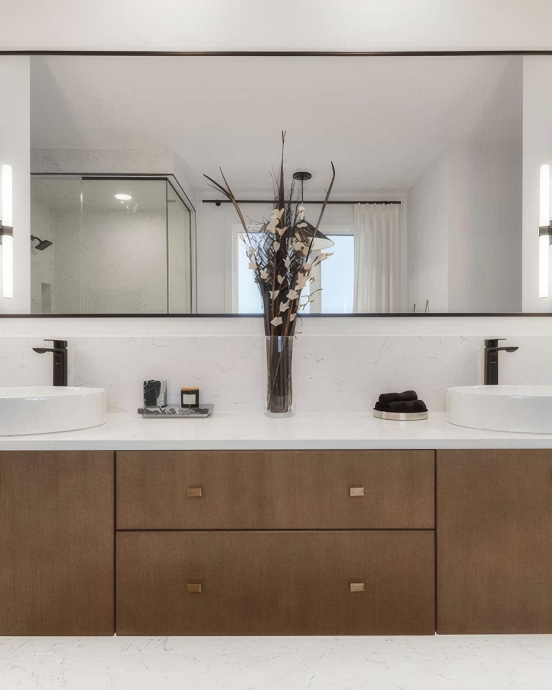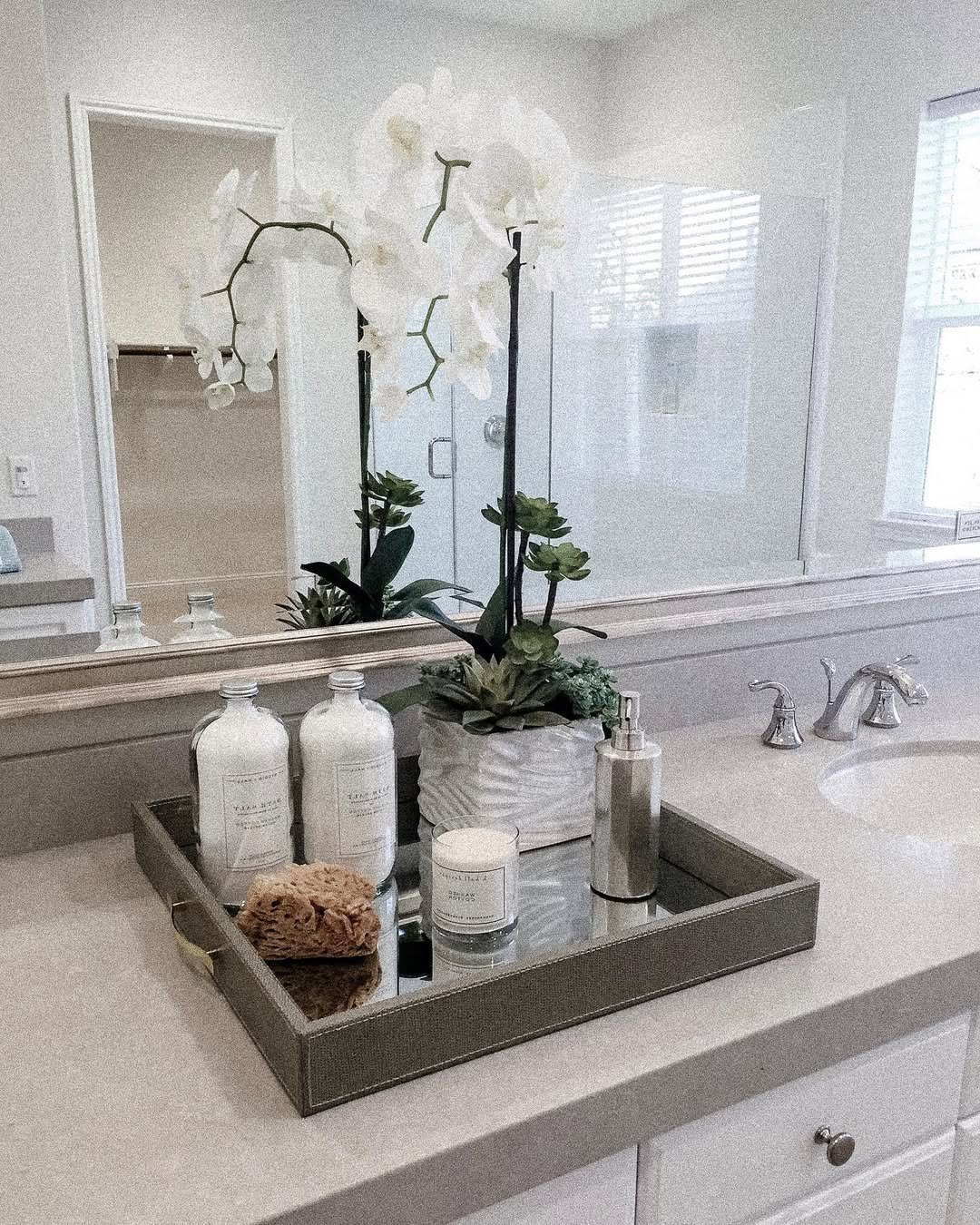 There’s something so satisfying about this setup. The double sinks, perfectly spaced decor, and that tall central arrangement—it all feels balanced in the best way.