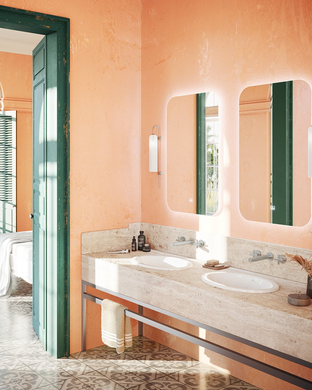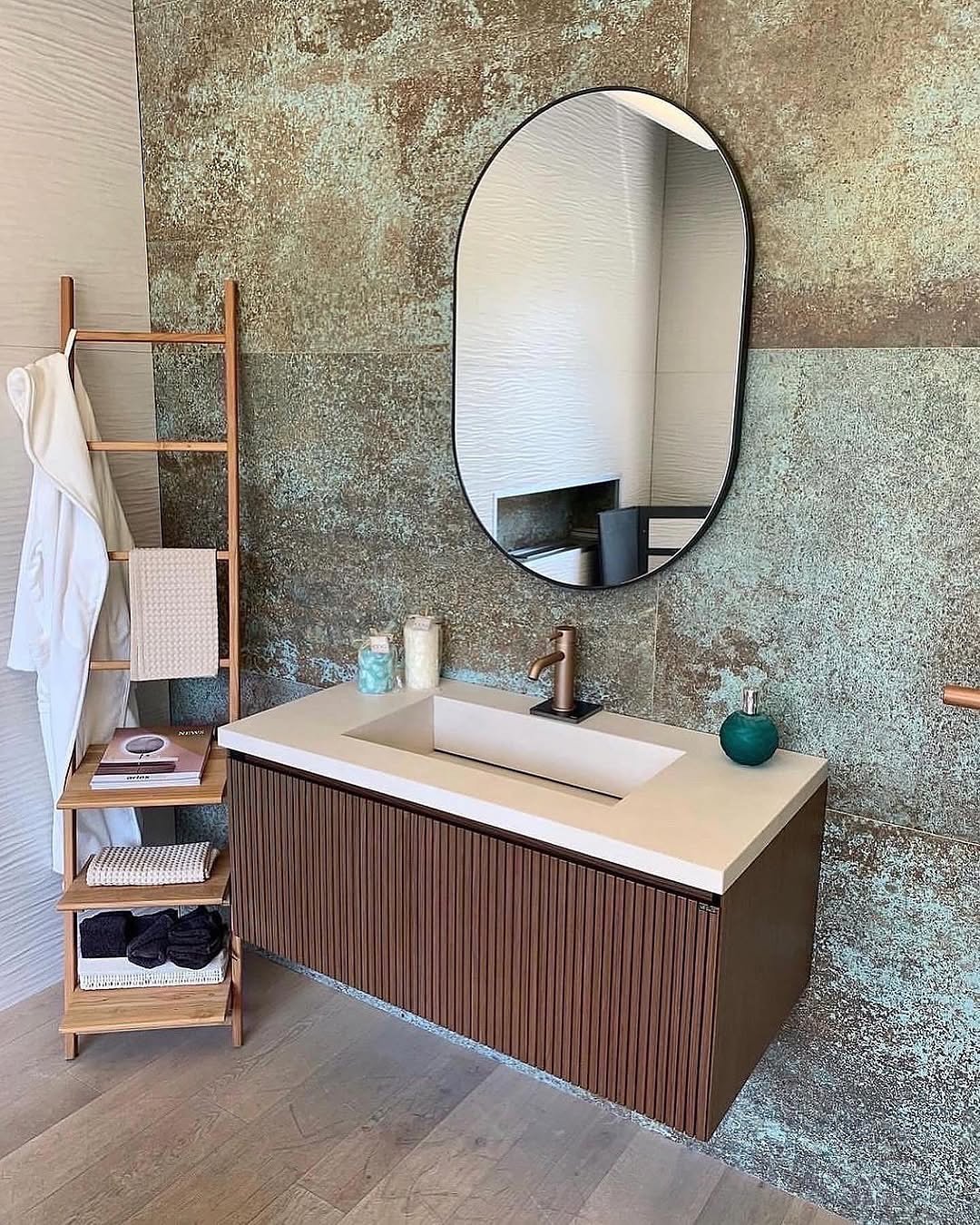 This one is all about that wall. The textured, almost patina-like finish behind the vanity creates depth without needing extra decor cluttering the counter.