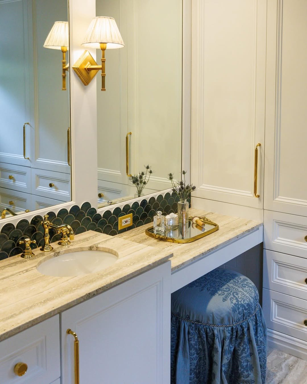 This setup feels like a dressing room moment—and honestly, why shouldn’t your bathroom feel that good? The marble counter paired with that scalloped tile detail adds just enough personality without going over the top.
