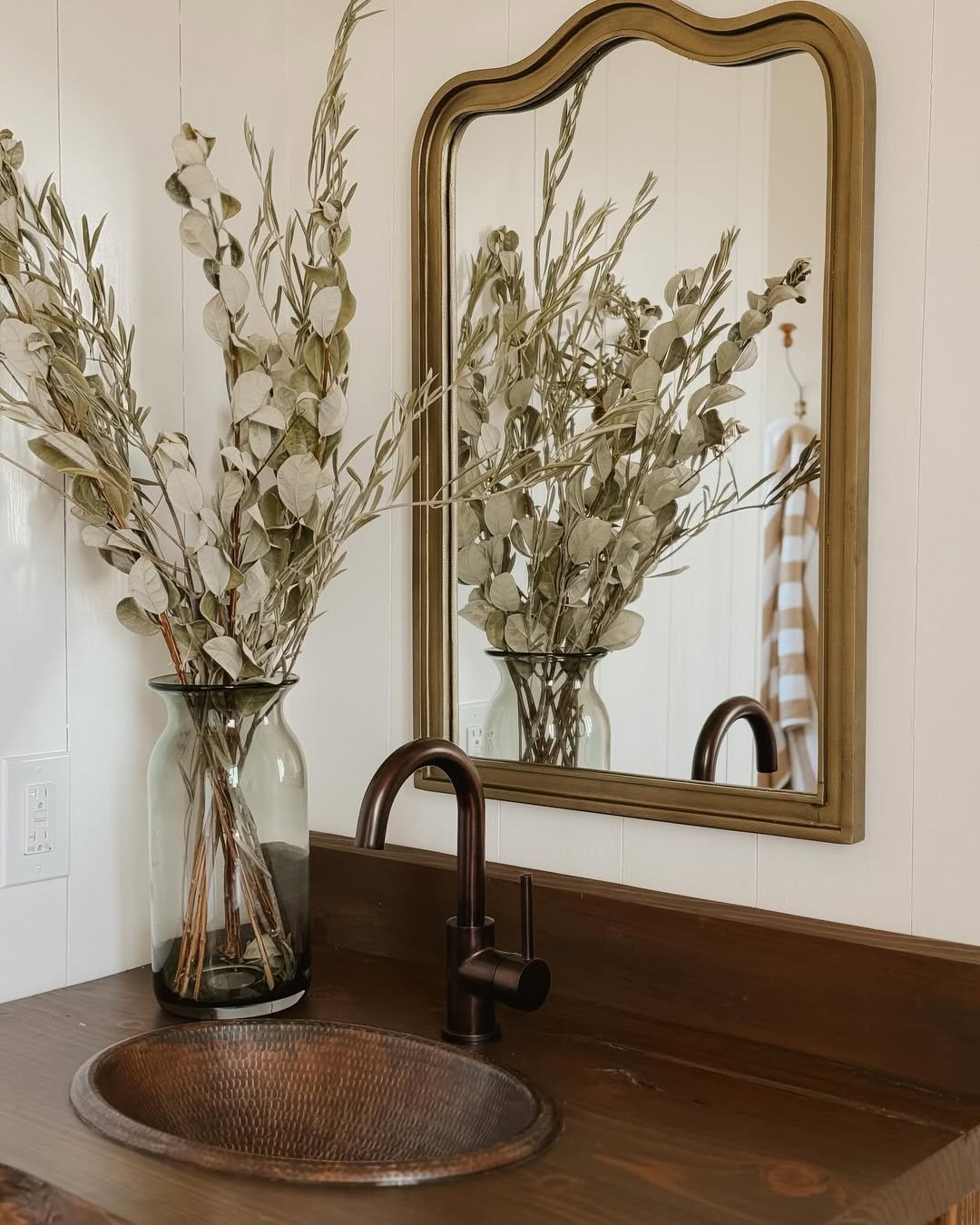 This one feels quietly luxurious. The warm brass tones, the curved mirror, and that simple glass vase filled with dried stems—it’s understated but so well styled.