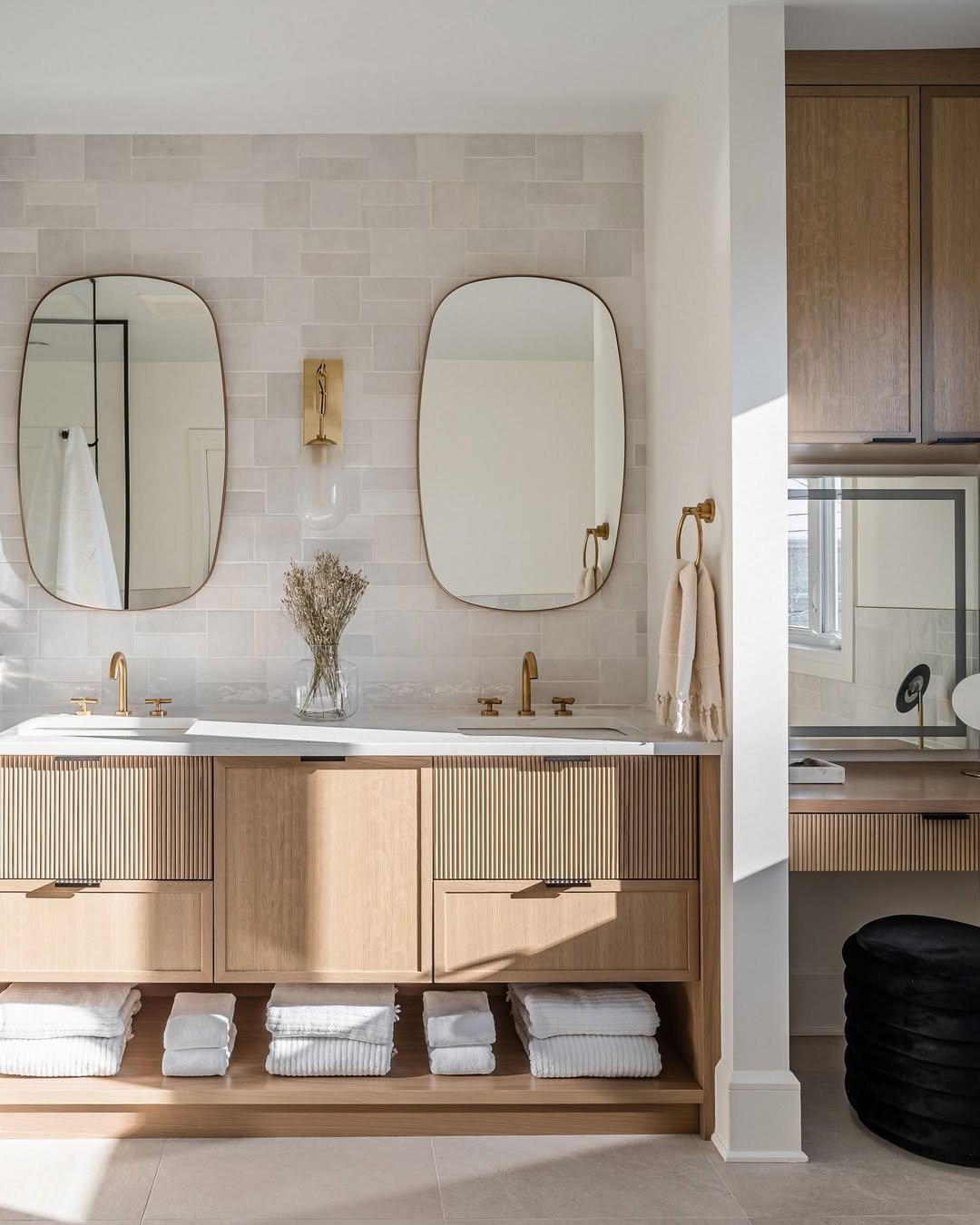 This space feels like a deep breath in design form. The soft wood tones, fluted cabinet texture, and those perfectly imperfect oval mirrors create a look that’s warm but still incredibly refined. Nothing feels overdone—it’s all about subtle detail.