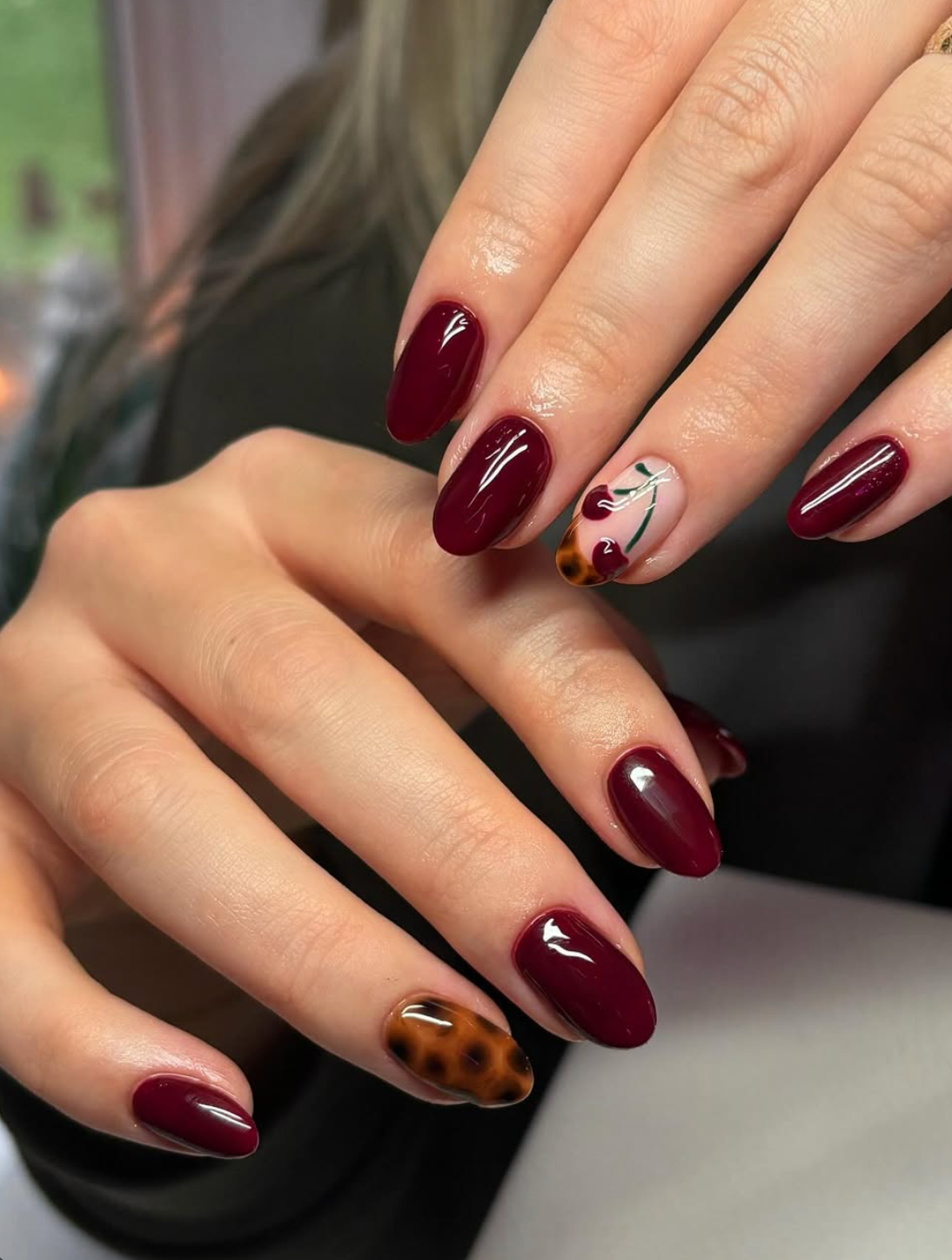 If burgundy had a sultry cousin, this set would be it. The deep red polish is already a mood, but the way it’s paired with that tortoiseshell accent? Chef’s kiss. And then the cherries—cute, playful, just a little flirty. It’s giving “I’m sophisticated, but yes, I also like fun.”
