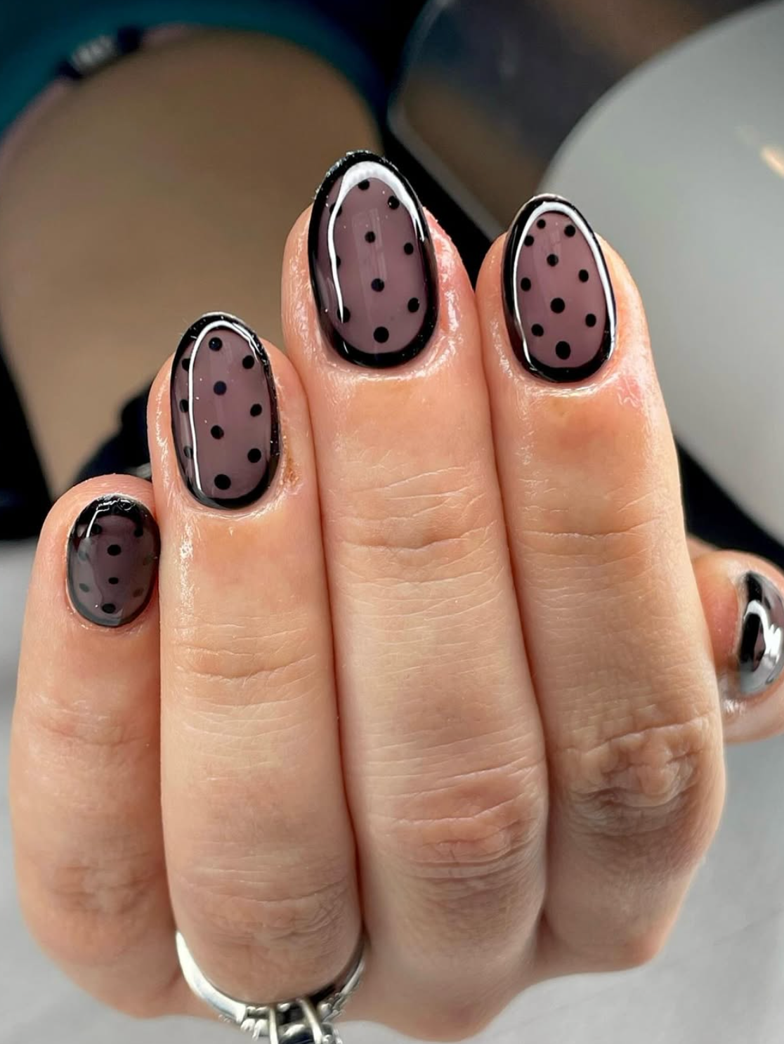 These nails give a soft, sheer vibe with a playful twist. The black dots over the muted taupe base feel like a fun winter take on tights — slightly sultry, perfectly tidy, and super wearable.