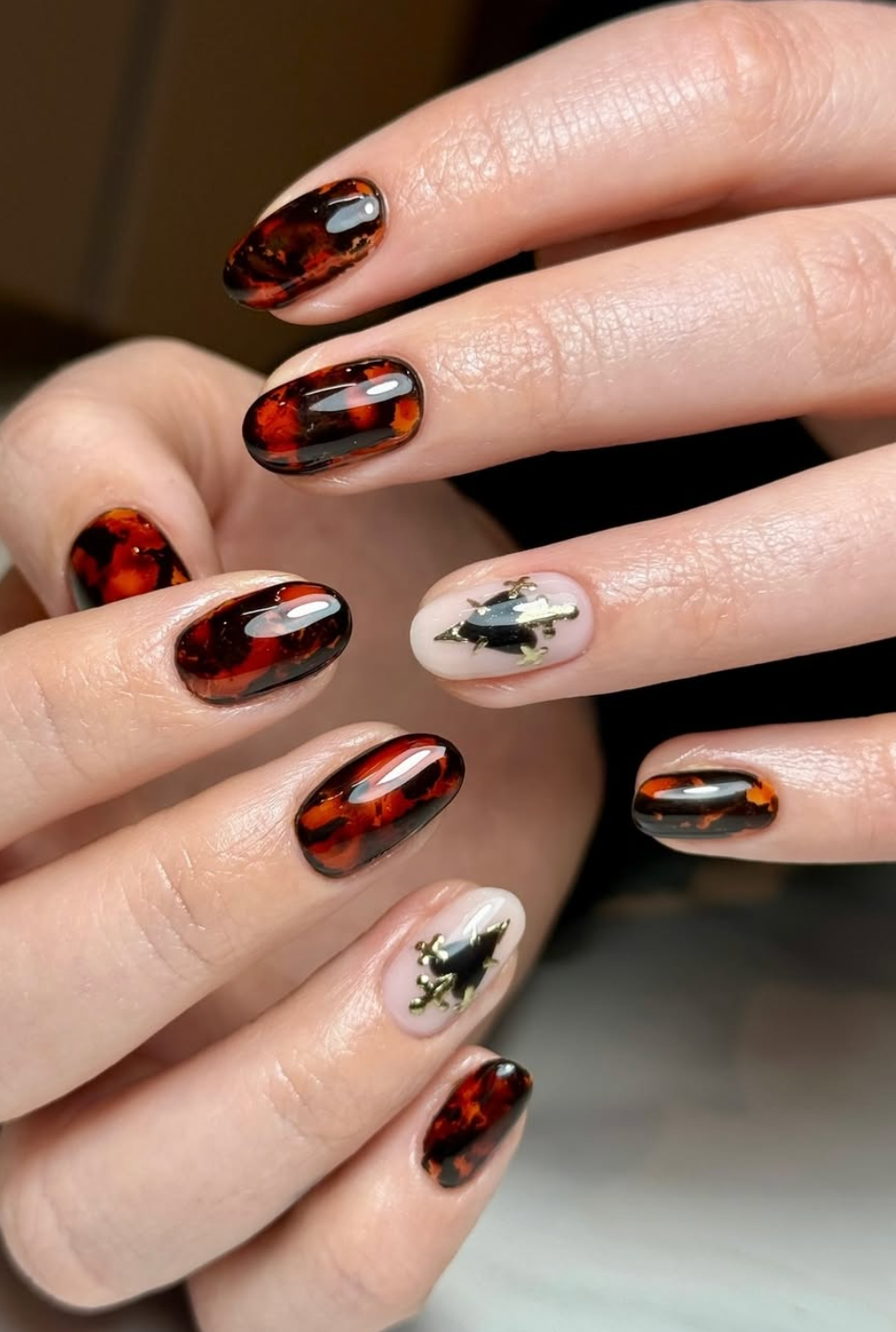 These tortoiseshell nails are basically jewelry. The marbled amber tones make each nail look like it was carved from vintage resin—and that little gold-framed black accent? A tiny work of art. It feels expensive without even trying.