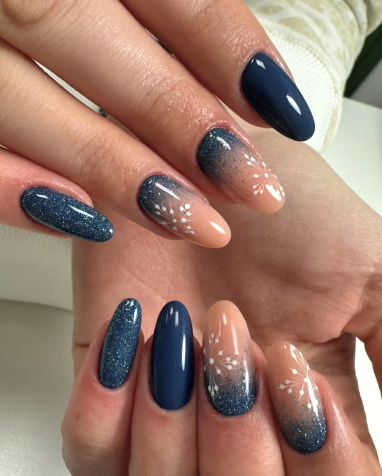 Deep navy meets nude in the most elegant way here. The glittery ombré feels like a night sky dusted with fresh snow, and those delicate white branches add a soft, wintry touch that isn’t too literal.