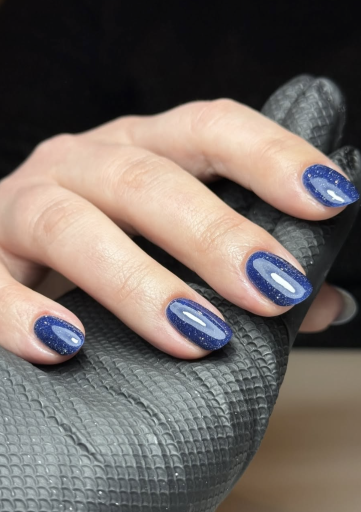 This deep navy glitter is giving cold, crisp winter night energy. It’s bold but not loud, sparkly but not chaotic—just that perfect shimmer you catch when the moon hits fresh snow.